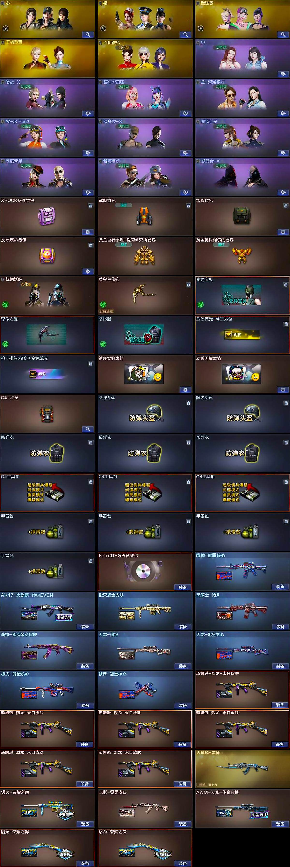 - [11528915]可二次 可修改实名 排位资格:有 2王者武器 1炫金武器 110V武器 7V角色 31皮肤 可排位 武器:G36C-幻影,柯尔特-竞技荣光,擎天-竞技荣光,AK12-天启,炼狱-百战金芒,QBZ03-金色蔷薇,AK47-B-身先士卒,AK47-B-常胜将军,黑武士-锦绣游龙,Barrett-暗月传说,烟雾弹-竞技荣光,炫金千变,COP-堕天神,M200-竞技荣光,神圣爆裂者III,无影-神兵利器,闪光弹-雷暴,闪光弹-堕天神,闪光弹-雷霆,王者星神-觉醒版,云龙扇,Barrett-毁灭,王者之锋-觉醒版,死亡之眼,王者之击-觉醒版,闪光弹-云龙,雷霆之契,王者之灵-觉醒版,M4A1-黑骑士,COP 357-云龙,雷霆之锋,M4A1-堕天神,M4A1-再燃火线,VSK-94-金蚀,麒麟刺-百战金芒,黑骑士-海王,闪光弹-竞技荣光,斯泰尔-蝴蝶,幻灵之锋,烟雾弹-雷暴,高爆手雷-竞技荣光,王者之啸-觉醒版,高爆手雷-雷霆,高爆手雷-雷暴王者,斩神刀-雷暴,白虎-电玩蓝兔,匕首-幻能朋克,高爆手雷-堕天神,烟雾弹-雷霆,烟雾弹-堕天神,死神-雪域霜狐,麒麟刺-堕天神,高爆手雷-雷暴,机械迷城-穹宇,AK-47-猩红传说,龙啸-堕天神,屠龙,M4A1-雷神,AK47-B-战士,Kar98K-星神,轻型军用手斧-再燃火线,AK47-火麒麟,高爆手雷-云龙,高爆手雷-雷霆王者,M200-幻神,M4A1-雷霆王者-觉醒版,COP 357-幻灵,麒麟刺