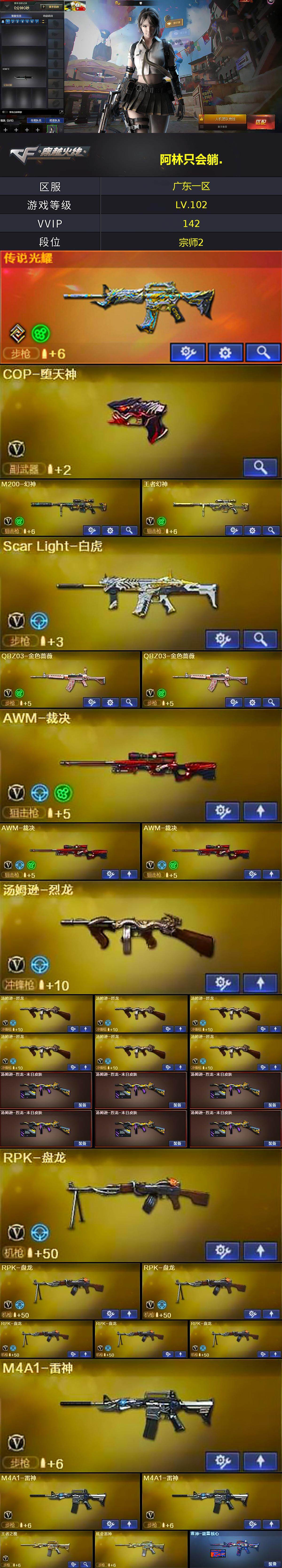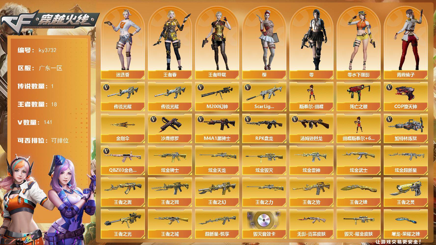 [14014757]广东一区-141V-18王者-16炫金 【传说武器】:传说光耀 【热门武器】:传说光耀,QBZ03-金色蔷薇*2,Scar Light-白虎,M200-幻神,死亡之眼*2,M4A1-黑骑士*6,汤姆逊-烈龙*7,RPK-盘龙*6,加特林-炼狱*3,斯泰尔-蝴蝶,COP-堕天神,沙鹰-修罗*3,金刚伞 【王者炫金武器】:王者之城,王者之戮,超新星-悦享*3,王者之幻,王者之翼,王者之势,王者之光,王者之力*3,王者之灵,王者之锋,炫金骑士*3,炫金雷神,炫金武士,炫金超新星*4,炫金毁灭*5,炫金天龙*2 【音效卡】:Barrett-毁灭音效卡 【皮肤】:汤姆逊-烈龙-末日皮肤*6,雷神-能量核心,火麒麟-雷神,AK47-火麒麟-传奇EVEN,毁灭-荣耀之怒,毁灭耀金皮肤,黑骑士-暗月,无影-霓裳皮肤,战神-紫绶金章皮肤,天龙-秘银,天龙-能量核心,AWM-天龙-传奇白鲨,极光-能量核心,修罗-能量核心,屠龙-荣耀之锋*2 【角色】:零,樱,迷迭香,王者春,王者玲珑,乔伊教练,空,暗夜-X,嘉年华灵狐,兰-海滩派对,零-水下丽影,潘多拉-X,青霞仙子,铁骑荣耀,新娜塔莎,影武者-X 【人偶武器】:斯泰尔-蝴蝶,巴雷特-零-水下丽影,AWM-灵狐-15周年嘉年华,M37-葵,迷你裂空之翼*8,迷你波特博士*3,迷你曼提柯尔,迷你火种*3 【暴走生化】:死亡之眼*2,超级对讲机 【挑战大师】:暴君乱世-超越Max,神圣爆裂者III,冰龙粉碎者-白马银枪,激光毁灭者III-白马银枪*2,VEPR-12-金魔,激光毁灭者III*3,机甲撕裂者III,KAC-圣炎切割者III,阐释者III*2,惩戒者III*3,VEPR-12-紫魔 【英雄级武器】:AK47-火麒麟*4,M4A1-雷神*3,M4A1-黑骑士*6,M4A1-死神*2,AK47-黑武士*4,AK12-天启,AN94-超新星,AK47-黑鲨,M4A1-龙血,M4A1-堕天神,Scar Light-白虎,无影-神兵利器,QBZ03-金色蔷薇*2,M4A1-猎神*2,烈火-动感闪耀,王者之魄-觉醒版,黑武士-CF网剧冠军,AWM-天龙*2,Barrett-毁灭*8,Barrett-极光*2,AWM-裁决*3,M200-幻神,Barrett-金色蔷薇,王者幻神-觉醒版,RPK-盘龙*6,加特林-炼狱*3,汤姆逊-烈龙*7