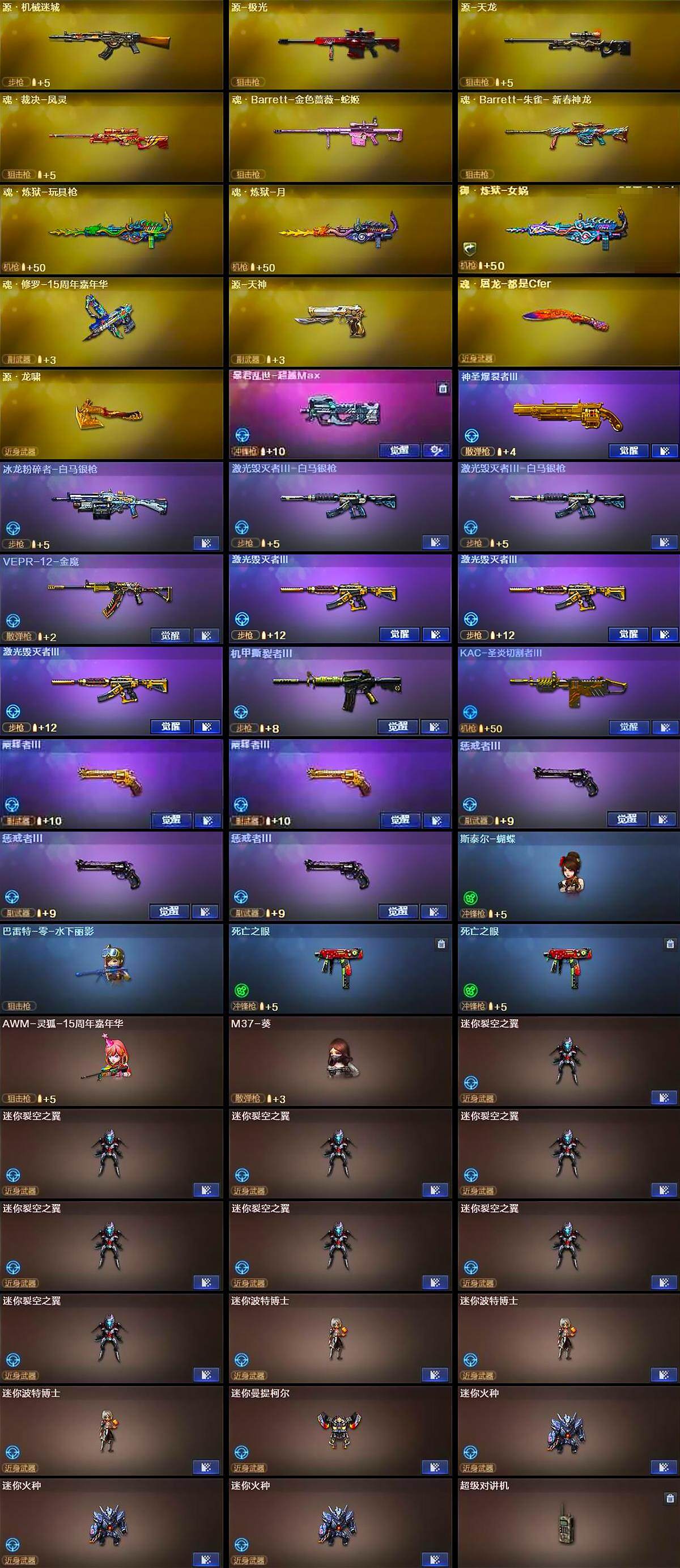 【英雄级武器】:AK47-火麒麟*4,M4A1-雷神*3,M4A1-黑骑士*6,M4A1-死神*2,AK47-黑武士*4,AK12-天启,AN94-超新星,AK47-黑鲨,M4A1-龙血,M4A1-堕天神,Scar Light-白虎,无影-神兵利器,QBZ03-金色蔷薇*2,M4A1-猎神*2,烈火-动感闪耀,王者之魄-觉醒版,黑武士-CF网剧冠军,AWM-天龙*2,Barrett-毁灭*8,Barrett-极光*2,AWM-裁决*3,M200-幻神,Barrett-金色蔷薇,王者幻神-觉醒版,RPK-盘龙*6,加特林-炼狱*3,汤姆逊-烈龙*7