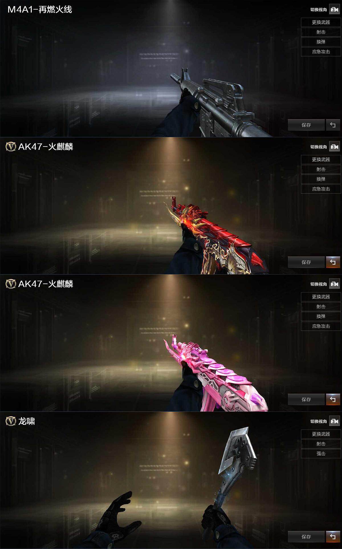 【英雄级武器】:AK47-火麒麟,无影-神兵利器,炼狱-百战金芒,麒麟刺,麒麟刺-百战金芒,M4A1-赤狱骑士,M4A1-苍鸣雷神