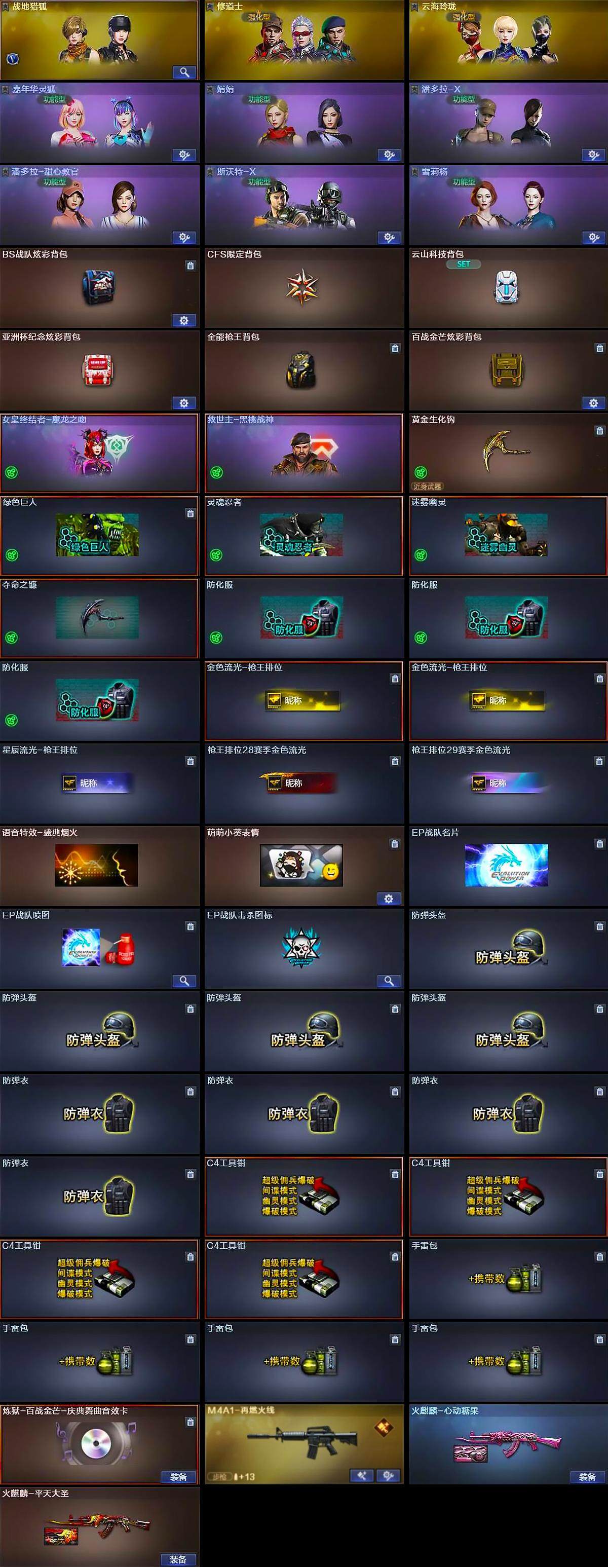 【道具】:BS战队炫彩背包,CFS限定背包,云山科技背包,亚洲杯纪念炫彩背包,全能枪王背包,百战金芒炫彩背包,女皇终结者-魔龙之吻,救世主-黑桃战神,黄金生化钩,绿色巨人,灵魂忍者,迷雾幽灵,夺命之镰,防化服*3,金色流光-枪王排位*2,星辰流光-枪王排位,枪王排位28赛季金色流光,枪王排位29赛季金色流光,语音特效-盛典烟火,萌萌小葵表情,EP战队名片,EP战队喷图,EP战队击杀图标,防弹头盔*4,防弹衣*4,C4工具钳*4,手雷包*4