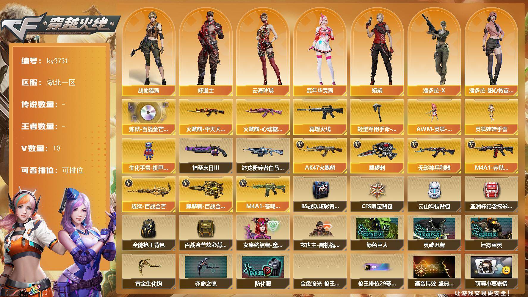 [14014886]湖北一区-10V-0王者-0炫金 【音效卡】:炼狱-百战金芒-庆典舞曲音效卡 【皮肤】:M4A1-再燃火线,火麒麟-平天大圣,火麒麟-心动糖果,轻型军用手斧-再燃火线 【角色】:战地猎狐,修道士,云海玲珑,嘉年华灵狐,娟娟,潘多拉-X,潘多拉-甜心教官,斯沃特-X,兔囡囡,雪莉杨 【人偶武器】:AWM-灵狐-15周年嘉年华,生化手雷-机甲核心*3,灵狐娃娃手雷 【挑战大师】:冰龙粉碎者-白马银枪*2,神圣爆裂者-末日III 【英雄级武器】:AK47-火麒麟,无影-神兵利器,炼狱-百战金芒,麒麟刺,麒麟刺-百战金芒,M4A1-赤狱骑士,M4A1-苍鸣雷神 【道具】:BS战队炫彩背包,CFS限定背包,云山科技背包,亚洲杯纪念炫彩背包,全能枪王背包,百战金芒炫彩背包,女皇终结者-魔龙之吻,救世主-黑桃战神,黄金生化钩,绿色巨人,灵魂忍者,迷雾幽灵,夺命之镰,防化服*3,金色流光-枪王排位*2,星辰流光-枪王排位,枪王排位28赛季金色流光,枪王排位29赛季金色流光,语音特效-盛典烟火,萌萌小葵表情,EP战队名片,EP战队喷图,EP战队击杀图标,防弹头盔*4,防弹衣*4,C4工具钳*4,手雷包*4 【特殊枪械】: