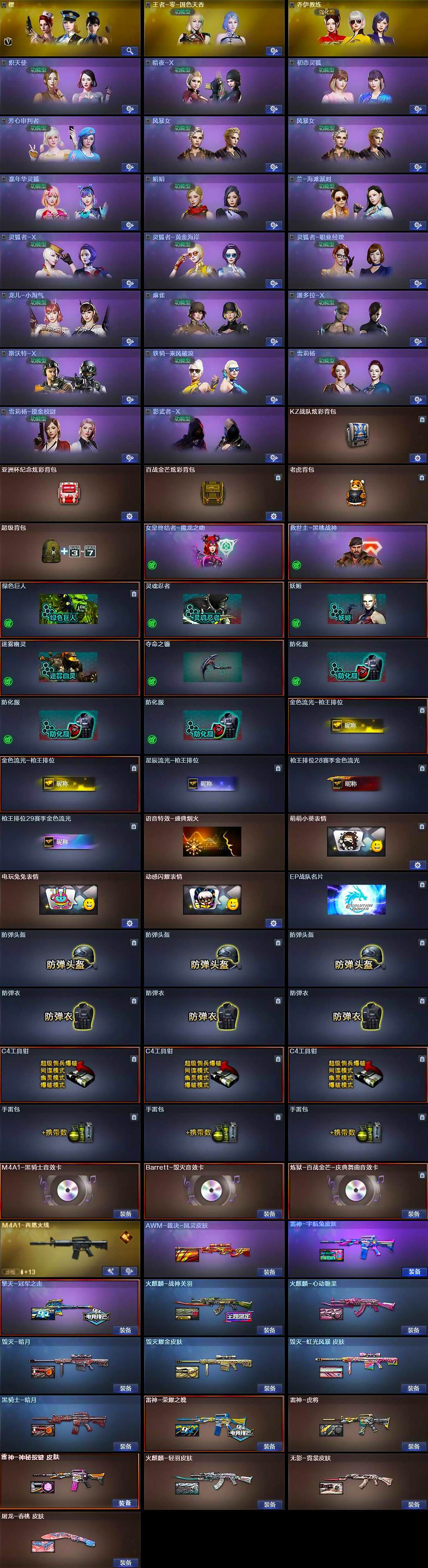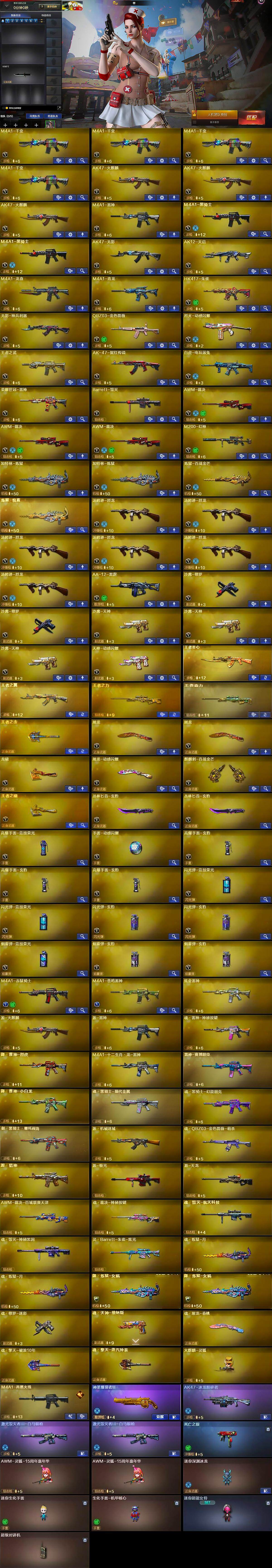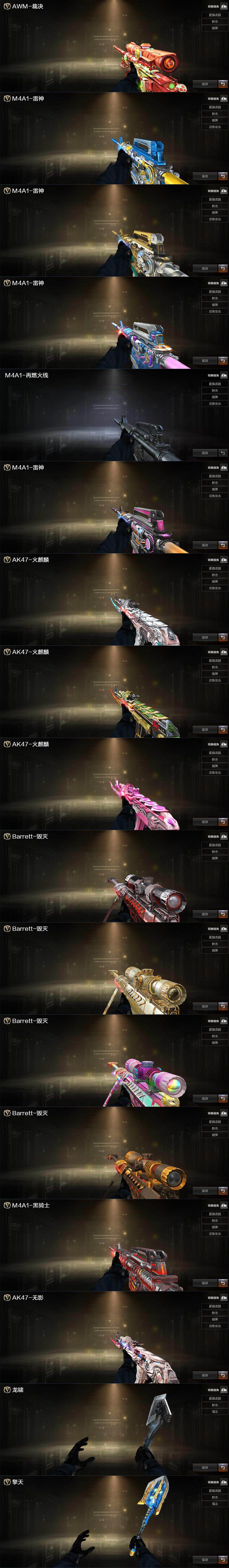 【英雄级武器】:M4A1-千变*4,AK47-火麒麟*3,M4A1-雷神,M4A1-黑骑士*2,AK47-无影,AK12-天启,M4A1-龙血,M4A1-青龙,HK417-朱雀,无影-神兵利器,QBZ03-金色蔷薇,烈火-动感闪耀,王者之武-觉醒版,AK-47-猩红传说,白虎-电玩蓝兔,荣耀世冠-雷神,Barrett-毁灭,AWM-裁决*3,M200-幻神,加特林-炼狱*2,炼狱-百战金芒,炼狱-悦蓝-觉醒版,汤姆逊-烈龙*6,AA-12-雷霆,沙鹰-修罗*2,沙鹰-天神*3,天神-动感闪耀,屠龙*2,龙啸,屠龙-动感闪耀,麒麟刺-百战金芒,王者之啸-觉醒版,丛林匕首-玄豹*2,高爆手雷-竞技荣光,手雷-动感闪耀,高爆手雷-玄豹*3,闪光弹-竞技荣光*2