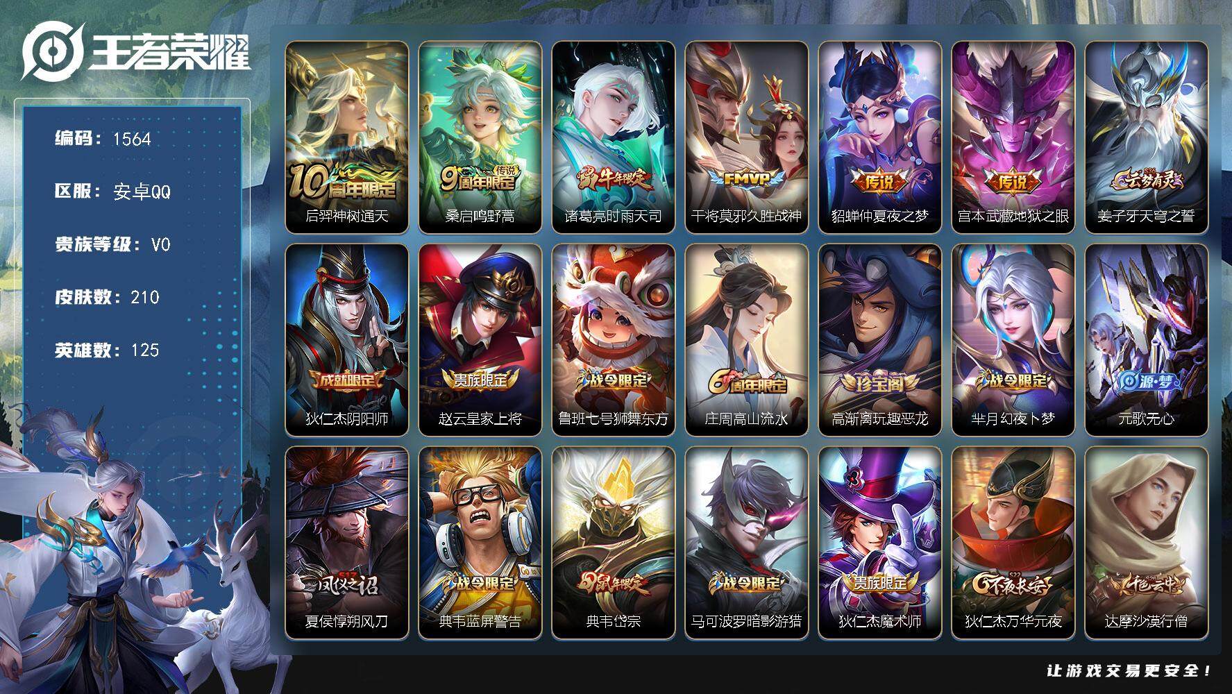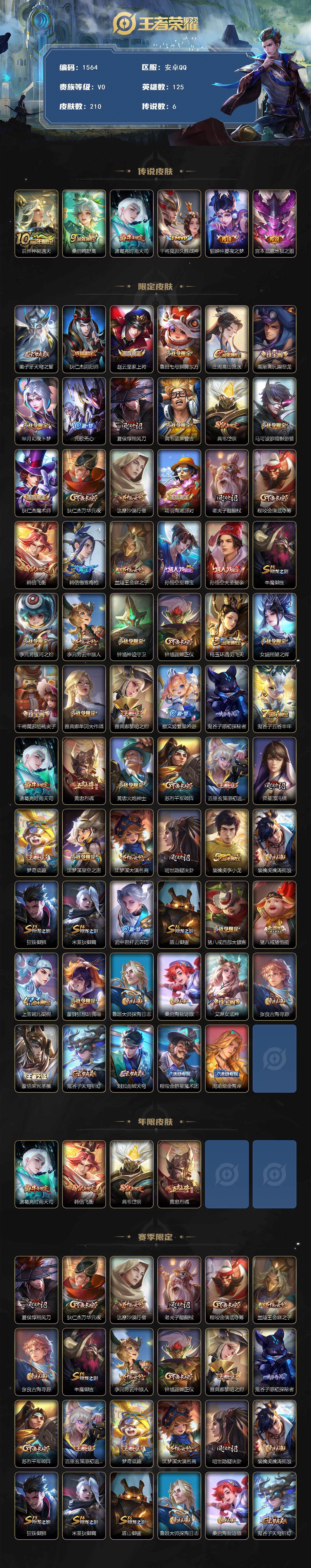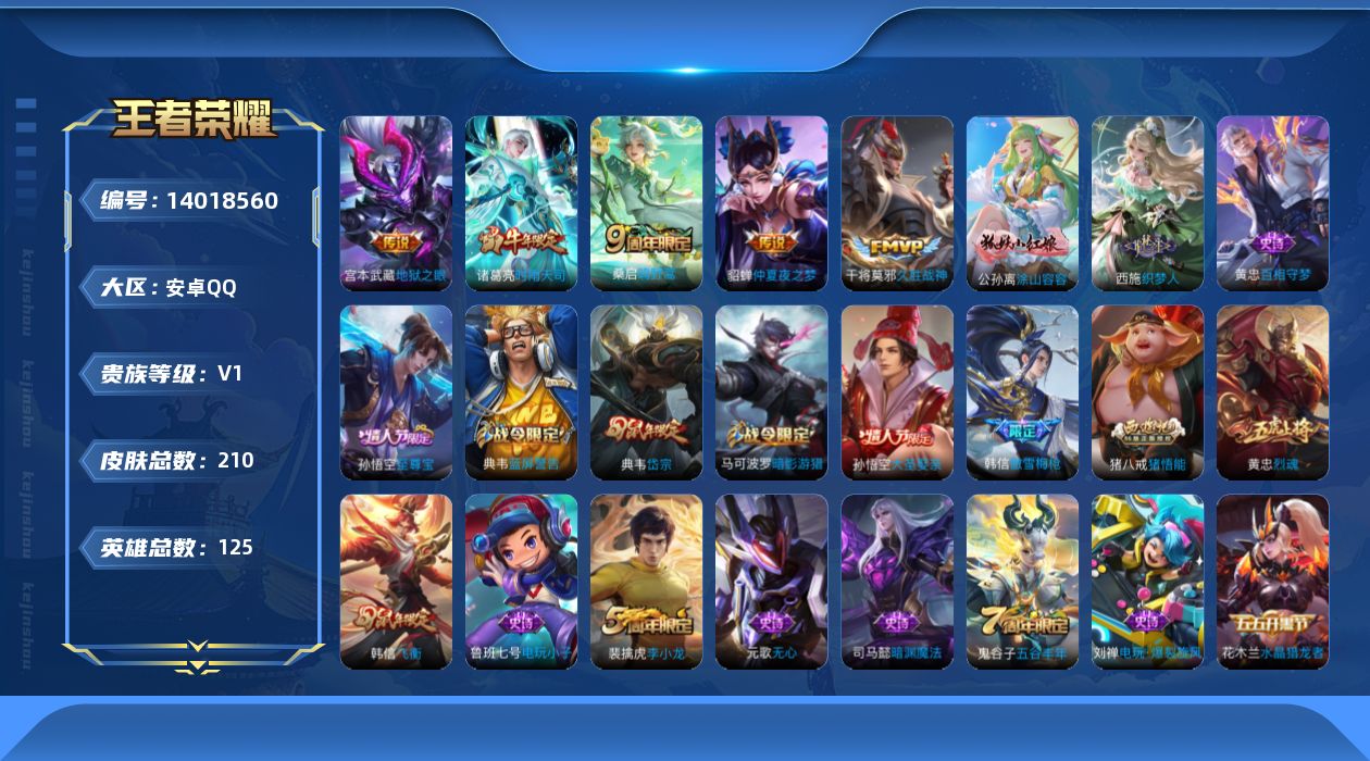 [14018560]安卓Q-V0-最强王者段位-125英雄-210皮肤-0典藏-0珍品无双-0无双-0珍品传说-6传说-60史诗