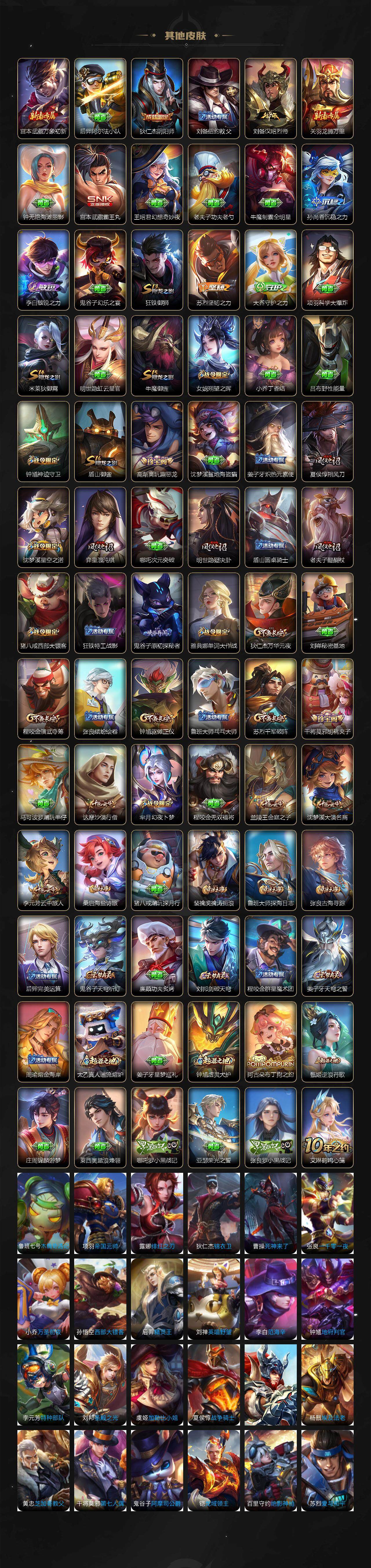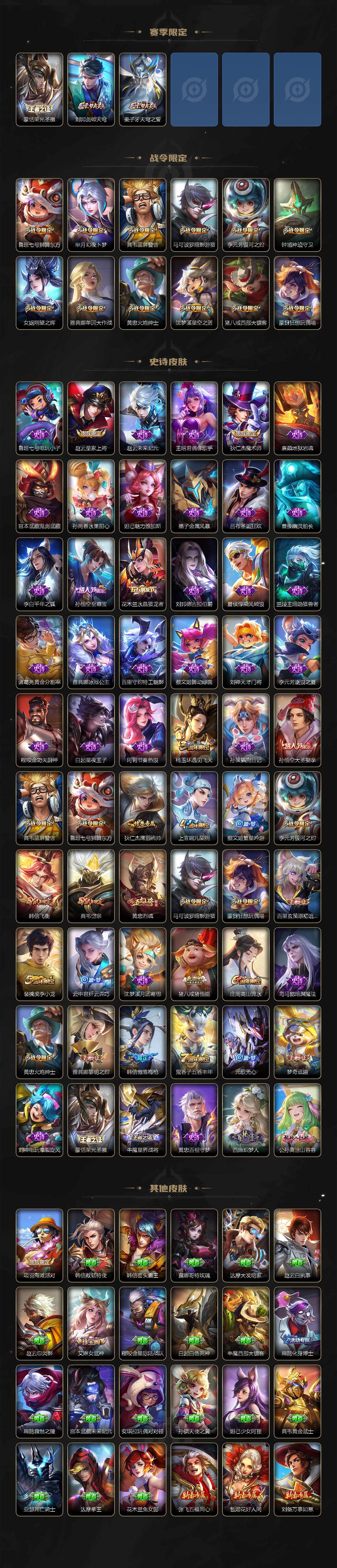 【限定皮肤】:姜子牙天穹之誓,狄仁杰阴阳师,赵云皇家上将,鲁班七号狮舞东方,庄周高山流水,高渐离玩趣恶龙,芈月幻夜卜梦,元歌无心,夏侯惇朔风刀,典韦蓝屏警告,典韦岱宗,马可波罗暗影游猎,狄仁杰魔术师,狄仁杰万华元夜,达摩沙漠行僧,项羽海滩派对,老夫子醍醐杖,程咬金演武夺筹,韩信飞衡,韩信傲雪梅枪,兰陵王金庭之子,孙悟空至尊宝,孙悟空大圣娶亲,牛魔御旌,李元芳银河之约,李元芳云中旅人,钟馗神迹守卫,钟馗驱傩正仪,杨玉环遇见飞天,女娲朔望之晖,干将莫邪胡桃夹子,雅典娜单词大作战,雅典娜黎明之约,蔡文姬繁星吟游,鬼谷子原初探秘者,鬼谷子五谷丰年,诸葛亮时雨天司,黄忠烈魂,黄忠火炮绅士,苏烈千军破阵,百里玄策原初追逐者,弈星混沌棋,梦奇顽趣,沈梦溪星空之诺,沈梦溪大漠名商,明世隐疑决卦,裴擒虎李小龙,裴擒虎擒涛扼浪,狂铁御狮,米莱狄御霄,云中君纤云弄巧,盾山御銮,猪八戒西部大镖客,猪八戒猪悟能,上官婉儿梁祝,蒙犽狂想玩偶喵,鲁班大师探海日志,桑启海盐诗旅,艾琳女武神,张良古海寻踪,蒙恬荣光圣徽,鬼谷子天穹祈灯,刘邦剑破天穹,程咬金群星魔术团,周瑜熔金海岸