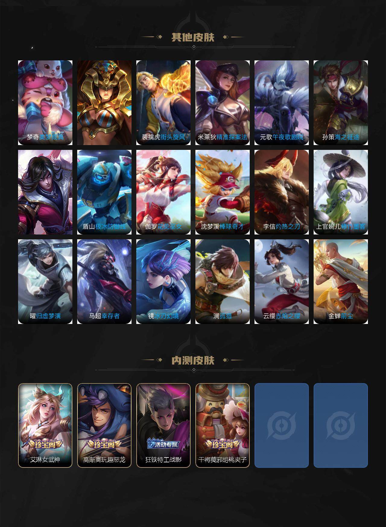 李元芳逐浪之夏,孙策猫狗日记,阿轲节奏热浪,诸葛亮黄金分割率,王昭君偶像歌手,雅典娜冰冠公主,鲁班七号电玩小子,刘禅天才门将,白起星夜王子,程咬金功夫厨神,刘邦德古拉伯爵,兰陵王暗隐猎兽者,曹操幽灵船长,宫本武藏鬼剑武藏,司马懿暗渊魔法,蔡文姬舞动绿茵,廉颇地狱岩魂,夏侯惇乘风破浪,花木兰水晶猎龙者,墨子金属风暴,百里玄策原初追逐者,吕布圣诞狂欢,百里守约特工魅影,雅典娜黎明之约,李白千年之狐,刘禅电玩·爆裂旋风