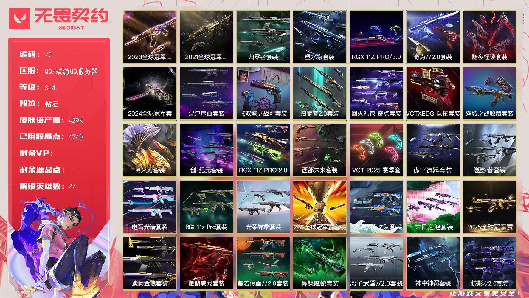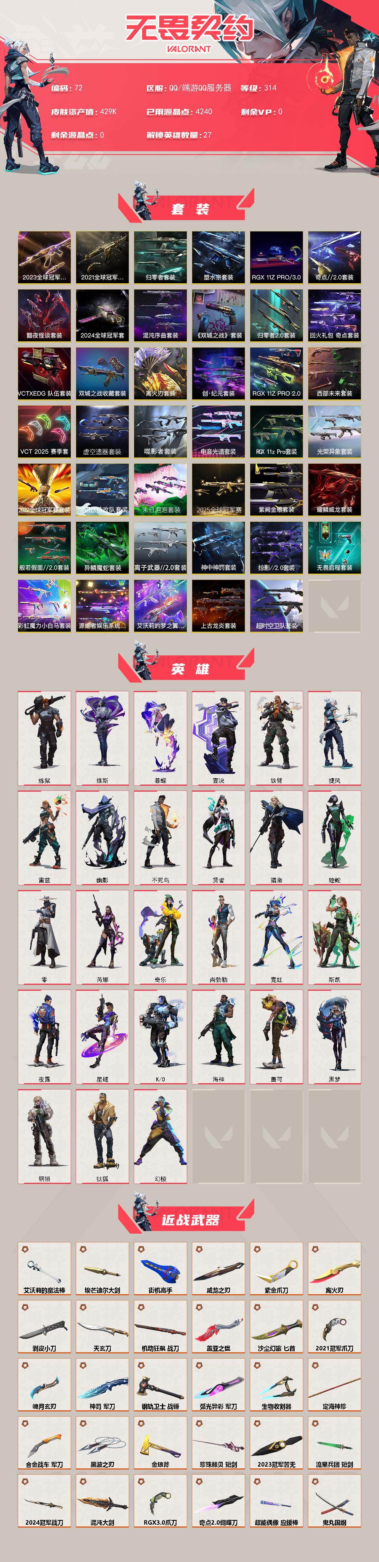 [14035330]【套装】:2025全球冠军赛套装,2024全球冠军赛套装,2023全球冠军赛套装,2022全球冠军赛套装,2021全球冠军赛套装,超时空卫队套装,源能者娱乐系统套装,上古龙炎套装,艾沃莉的梦之翼套装,末日泡泡套装,滋滋X特攻队套装,光荣异象套装,RGX 11z Pro套装,电音光谱套装,噬影者套装,虚空遗器套装,VCT 2025 赛季套装,西部未来套装,RGX 11z Pro//2.0套装,创·纪元套装,RGX 11z Pro//3.0套装,混沌序曲套装,塑水宗套装,离火刃套装,《英雄联盟:双城之战》套装,《双城之战》收藏套装,归零者//2.0套装,奇点//2.0套装,归零者套装,黯夜怪谈套装,VCTxEDG 队伍套装,回火礼包:奇点套装,般若假面//2.0套装,异鳞魔蛇套装,耀鳞威龙套装,紫阙金琅套装,离子武器//2.0套装,神中神罚套装,掠影//2.0套装,无畏启程套装,彩虹魔力小白马套装,离火刃套装 【英雄】:幻棱,炼狱,维斯,暮蝶,钛狐,壹决,铁臂,捷风,雷兹,幽影,不死鸟,贤者,猎枭,蝰蛇,零,芮娜,奇乐,尚勃勒,霓虹,斯凯,夜露,星礈,K/O,海神,盖可,黑梦,钢锁 【近战 武器】:近战武器-2025全球冠军赛 蝴蝶刀,近战武器-2024全球冠军赛 战刀,近战武器-2023全球冠军赛 苦无,近战武器-2022全球冠军赛 蝴蝶刀,近战武器-2021全球冠军赛 爪刀,近战武器-泡泡电锯,近战武器-魔术火花,近战武器-嘟昂嘟昂超弹力水球拳套,近战武器-影钩,近战武器-超时空卫队 三棱军刺,近战武器-无畏契约GO!第三卷 匕首,近战武器-5周年//公测重制版 苍龙之刃,近战武器-光荣异象 歧途,近战武器-RGX 11z Pro 战刀,近战武器-谐波音谱,近战武器-神之刃,近战武器-穿花蝴蝶,近战武器-RGX 11z Pro//2.0 蝴蝶刀,近战武器-剥皮小刀,近战武器-奇点//2.0 蝴蝶刀,近战武器-VCT 2025 爪刀,近战武器-紫金爪刀,近战武器-RGX 11z Pro//3.0 爪刀,近战武器-离火刃,近战武器-黑波之刃,近战武器-落英飞旋,近战武器-噬影者 簇刃,近战武器-镭切,近战武器-艾沃莉的魔法棒,近战武器-威龙之刃,近战武器-鬼丸国纲,近战武器-离子武器//2.0 爪刀,近战武器-荒狼之颚 蛮勇战斧,近战武器-双生獠牙,近战武器-双城之战