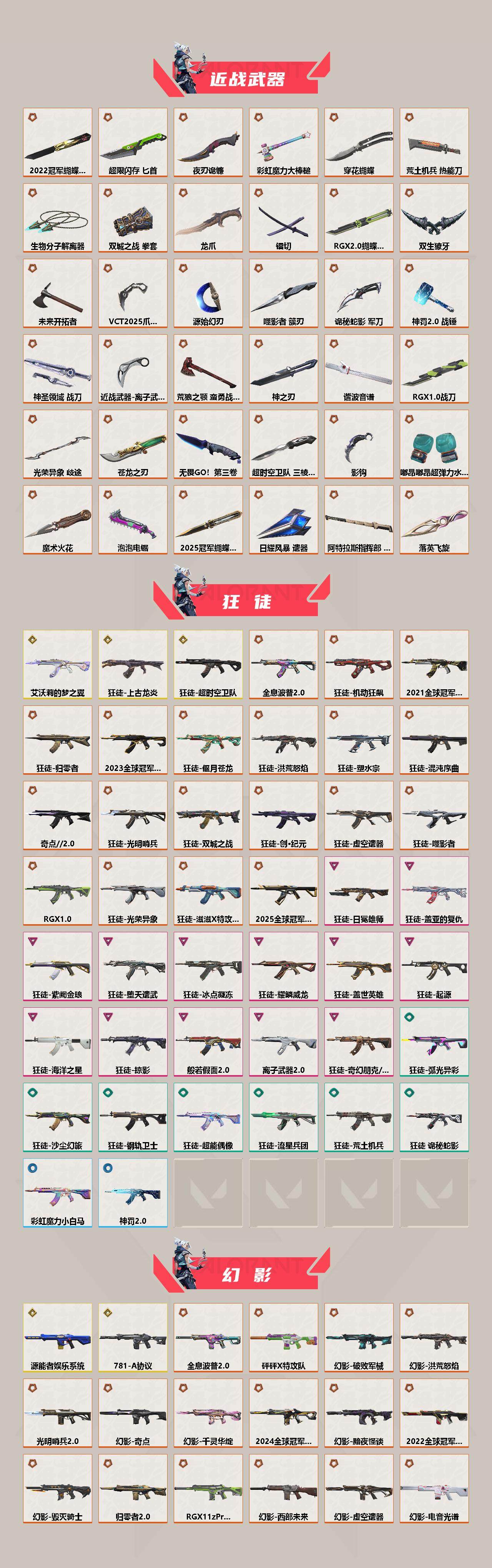 【近战 武器】:近战武器-2025全球冠军赛 蝴蝶刀,近战武器-2024全球冠军赛 战刀,近战武器-2023全球冠军赛 苦无,近战武器-2022全球冠军赛 蝴蝶刀,近战武器-2021全球冠军赛 爪刀,近战武器-泡泡电锯,近战武器-魔术火花,近战武器-嘟昂嘟昂超弹力水球拳套,近战武器-影钩,近战武器-超时空卫队 三棱军刺,近战武器-无畏契约GO!第三卷 匕首,近战武器-5周年//公测重制版 苍龙之刃,近战武器-光荣异象 歧途,近战武器-RGX 11z Pro 战刀,近战武器-谐波音谱,近战武器-神之刃,近战武器-穿花蝴蝶,近战武器-RGX 11z Pro//2.0 蝴蝶刀,近战武器-剥皮小刀,近战武器-奇点//2.0 蝴蝶刀,近战武器-VCT 2025 爪刀,近战武器-紫金爪刀,近战武器-RGX 11z Pro//3.0 爪刀,近战武器-离火刃,近战武器-黑波之刃,近战武器-落英飞旋,近战武器-噬影者 簇刃,近战武器-镭切,近战武器-艾沃莉的魔法棒,近战武器-威龙之刃,近战武器-鬼丸国纲,近战武器-离子武器//2.0 爪刀,近战武器-荒狼之颚 蛮勇战斧,近战武器-双生獠牙,近战武器-双城之战