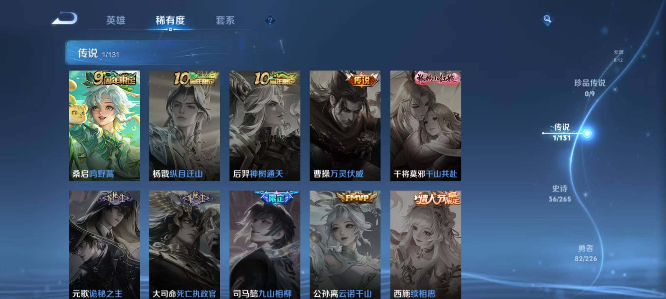 【赛季限定】:芈月重明,夏侯惇朔风刀,曹操烛龙,典韦穷奇,狄仁杰万华元夜,老夫子醍醐杖,程咬金演武夺筹,兰陵王金庭之子,张良古海寻踪,牛魔御旌,李元芳云中旅人,钟馗驱傩正仪,鬼谷子原初探秘者,苏烈千军破阵,弈星混沌棋,沈梦溪大漠名商,明世隐疑决卦,裴擒虎擒涛扼浪,狂铁御狮,米莱狄御霄,盾山御銮,鲁班大师探海日志,桑启海盐诗旅,鬼谷子天穹祈灯,刘邦剑破天穹