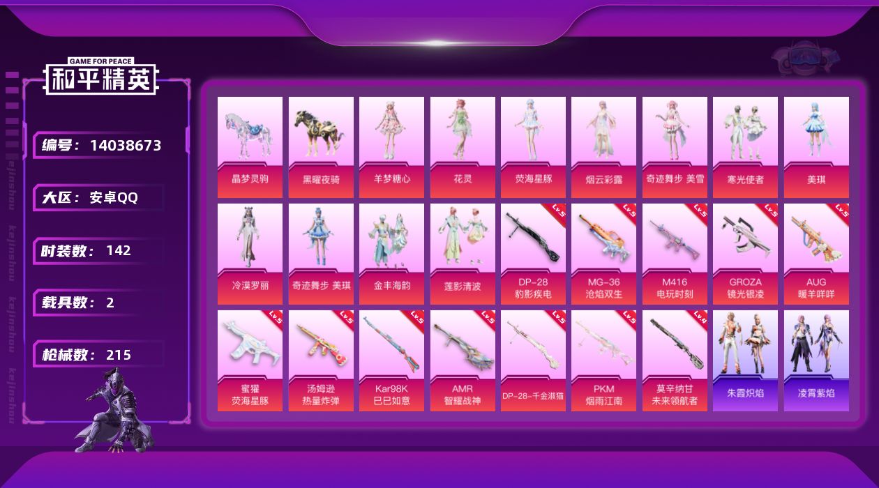 [14038673]【特价!急出!】安卓 手Q-11粉装-13特效枪-2载具-4粉色飞行器-72361热力值-11王牌印记-142套装-215枪皮 【热门品类】:套装-小丑鱼,套装-龟仙人 【粉色载具】:晶梦灵驹,黑曜夜骑 【粉色套装】:粉装-寒光使者,粉装-莲影清波,角色-烟云彩露,角色-美琪,粉装-金丰海韵,角色-冷漠罗丽,角色-荧海星豚,角色-奇迹舞步 美琪,角色-奇迹舞步 美雪,角色-花灵,角色-羊梦糖心 【粉色枪皮等级】:M416-电玩时刻(五级),GROZA-镜光银凌(五级),AUG-暖羊咩咩(五级),蜜獾-荧海星豚(五级),汤姆逊-热量炸弹(五级),Kar98K-巳巳如意(五级),Mk14-甜梦熊击(五级),莫辛纳甘-未来领航者(四级),AMR-智耀战神(五级),DP-28-千金淑猫(五级),DP-28-豹影疾电(五级),PKM-江南烟雨(五级),MG-36-沧焰双生(五级) 【粉色枪皮】:M416-电玩时刻,GROZA-镜光银凌,AUG-暖羊咩咩,蜜獾-荧海星豚,汤姆逊-热量炸弹,Kar98K-巳巳如意,Mk14-甜梦熊击,莫辛纳甘-未来领航者,AMR-智耀战神,DP-28-千金淑猫,DP-28-豹影疾电,PKM-江南烟雨,MG-36-沧焰双生 【粉色飞行器】:英伦信使飞行器,晶梦幻蝶飞行器,彩虹独角兽飞行器,灵猫魔法师飞行器 【粉色降落伞】:花间之火降落伞,焦糖拿铁降落伞,恐龙拽拽降落伞,仲夏莫吉托降落伞,莲影清波降落伞,蜜语绒猫降落伞,江南烟雨降落伞,精灵梦叶罗丽降落伞,鸢尾晶梦降落伞,创世·救赎降落伞,星梦奇缘降落伞,千金淑猫降落伞,动力核心降落伞,赛博古神降落伞,晶梦幻蝶降落伞,樱桃泡泡降落伞,星月云朵降落伞,雪月幻音降落伞,幻彩电音降落伞,冷漠罗丽降落伞,智趣喵喵降落伞,荧海星豚降落伞,灵猫魔法师降落伞,绯穹魔姬降落伞 【稀有套装】:套装-龟仙人,套装-绒宝小鹅,套装-巳巳如意,套装-雏菊兔兔,套装-萝兰蝴蝶,套装-小熊娃娃,套装-糖糖葫芦,套装-青团波波,套装-棉花软糖,角色-都市丽猫,角色-摩登魅猫,套装-燕燕于飞,套装-鱼渊荷华,套装-辉光之湖,套装-晶灵使者,套装-晶辉守护,套装-白辉玉蕊,套装-雪夜云雾,套装-晨曦轻云,套装-粉恋花,套装-紫幽梦,套装-蓝冰羽,角色-鲛海歌灵,套装-霓虹热舞,套装-彩虹兔,套装-云朵鹅,套装-雪绒豹,套装-蜜露汐语