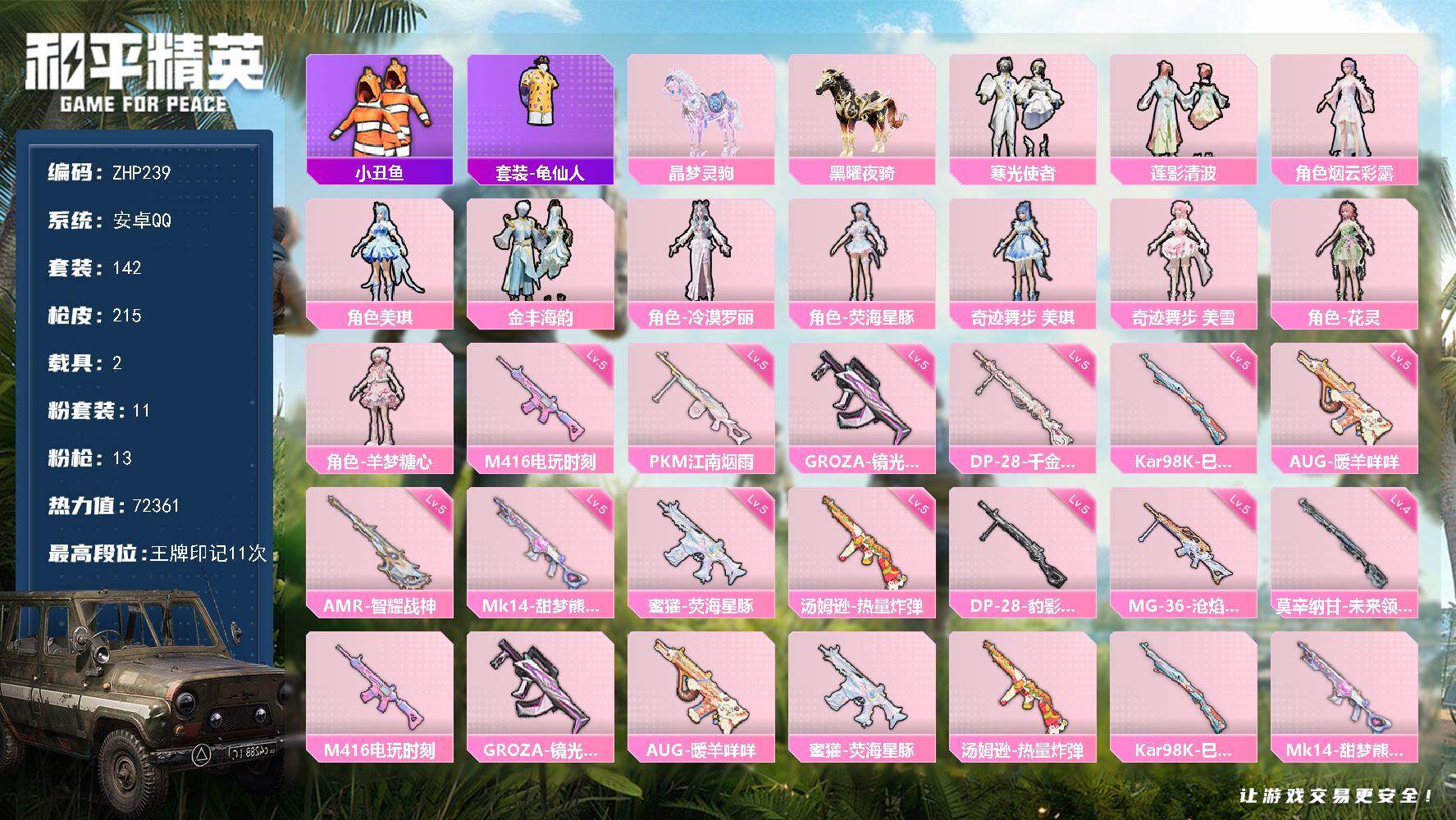 [14038673]【特价!急出!】安卓 手Q-11粉装-13特效枪-2载具-4粉色飞行器-72361热力值-11王牌印记-142套装-215枪皮