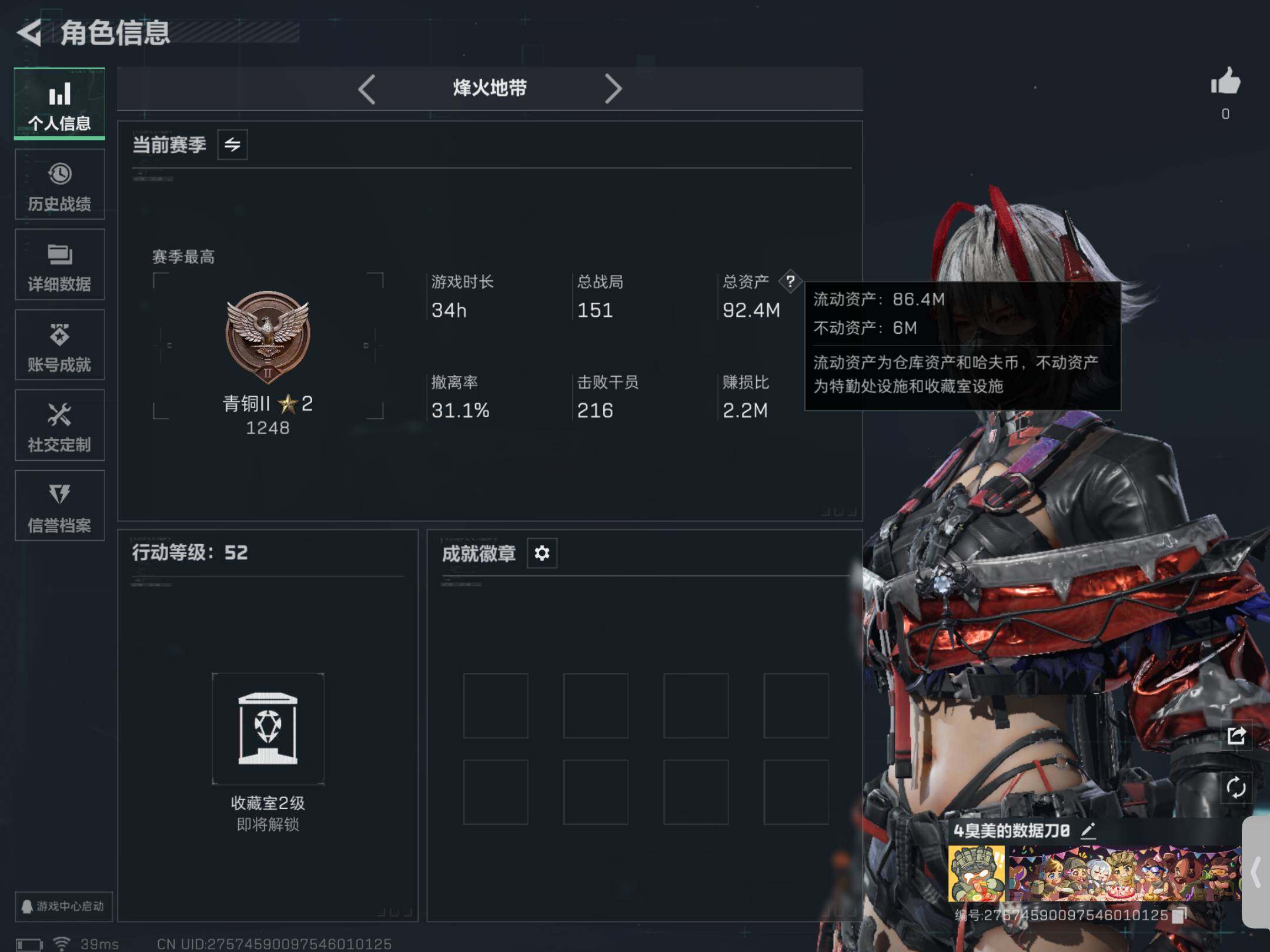 [14039382]可秒换绑 总资产92m 68508k哈伏币-92m流动资产-52烽火等级-青铜-1战场等级-无军衔