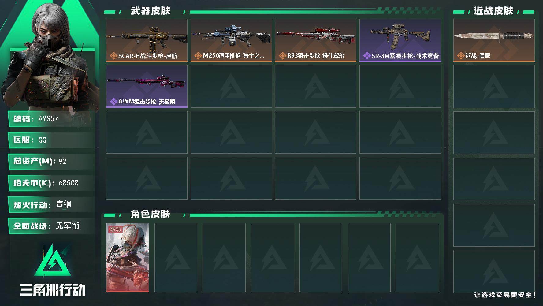 [14039382]可秒换绑 总资产92m 68508k哈伏币-92m流动资产-52烽火等级-青铜-1战场等级-无军衔 【干员外观】:骇爪-维什戴尔 【近战皮肤】:近战-黑鹰 【传说级普通外观】:SCAR-H战斗步枪-启航,M250通用机枪-骑士之心,R93狙击步枪-维什戴尔 【史诗级普通外观】:SR-3M紧凑突击步枪-战术竞备,AWM狙击步枪-无极限 【稀有级普通外观】:SMG-45-行动开启 【普通级普通外观】:M4A1突击步枪-粉色涂装,QBZ95-1突击步枪-高雅黑,QBZ95-1突击步枪-海浪,MP5冲锋枪-海色,Vector冲锋枪-几何迷彩,M1014霰弹枪-海浪 【军牌】:军牌-零号大坝,军牌-信誉优秀 【挂饰】:挂饰-统统拿走,挂饰-维什戴尔,挂饰-诡影狙击兵,挂饰-诡影喷火兵,挂饰-崩岩重炮,挂饰-启程