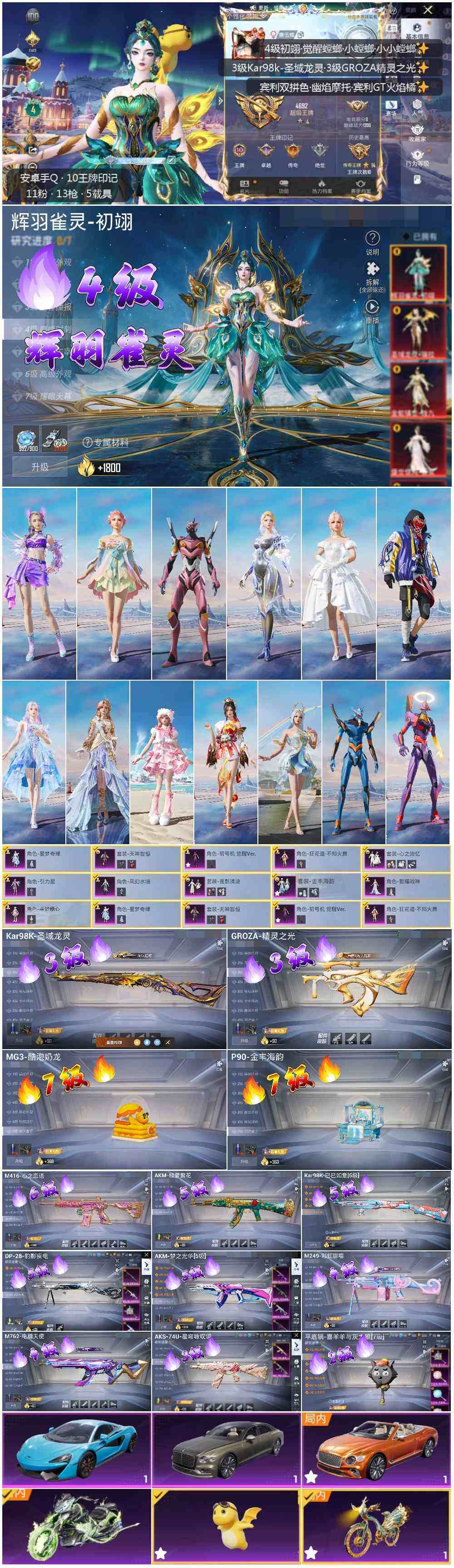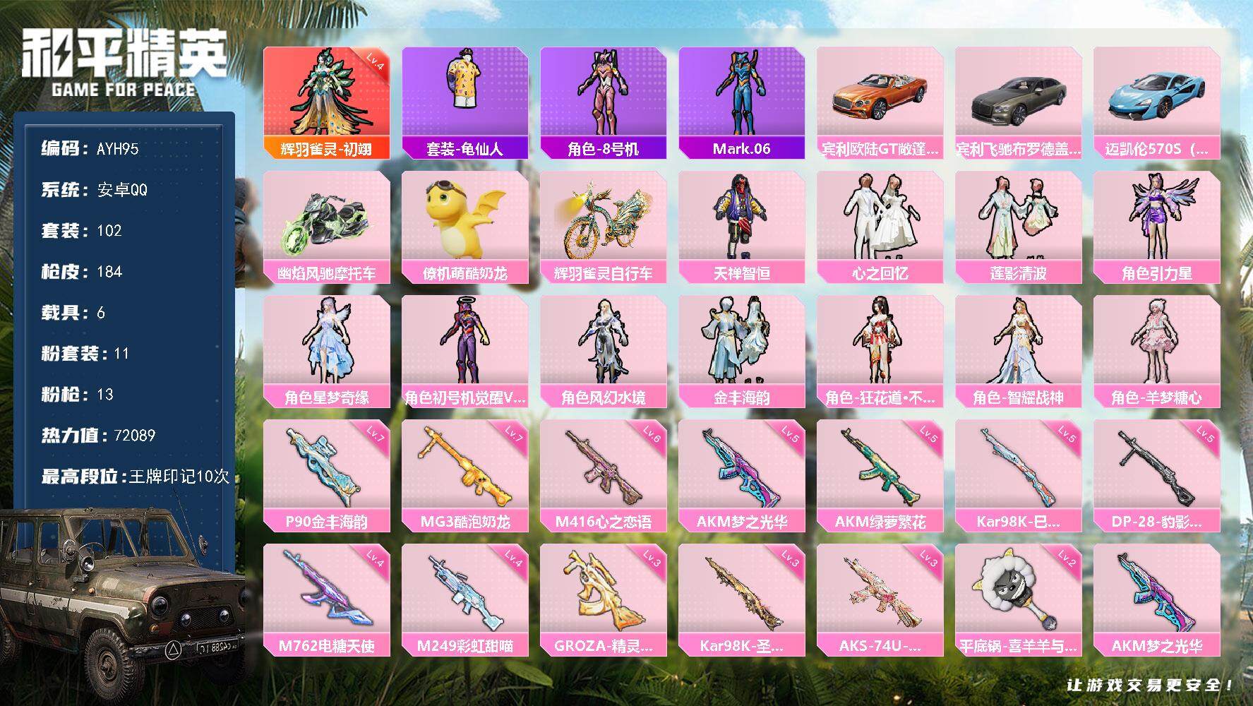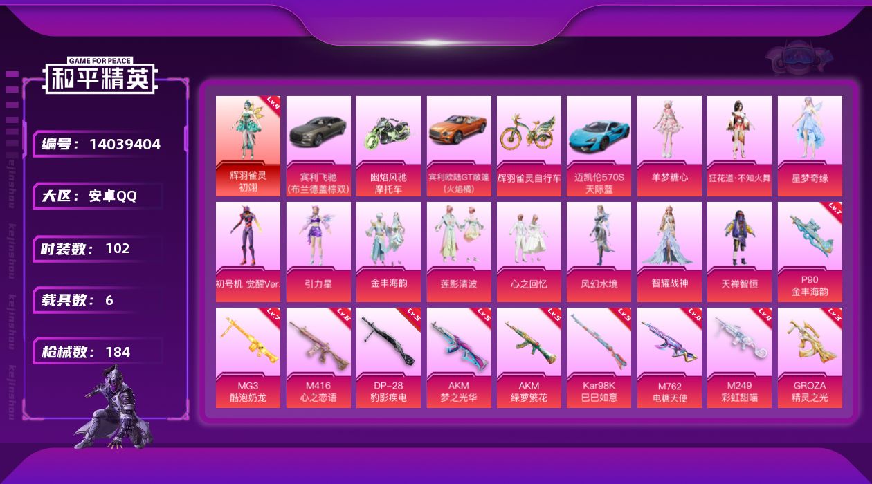 [14039404]地铁满天赋可二次,【店主推荐捡漏号!可直接换绑】安卓 手Q-1神装-11粉装-13特效枪-6载具-6粉色飞行器-72089热力值-10王牌印记-102套装-184枪皮【红色神装等级】:辉羽雀灵-初翊(四级)【红色角色神装】:辉羽雀灵-初翊【热门品类】:套装-龟仙人,角色-8号机,角色-Mark.06【粉色载具】:宾利欧陆GT敞篷(火焰橘),宾利飞驰(布罗德盖棕双色),迈凯伦570S(天际蓝),幽焰风驰摩托车,僚机-萌酷奶龙,辉羽雀灵自行车【粉色套装】:粉装-天禅智恒,粉装-心之回忆,粉装-莲影清波,角色-引力星,角色-星梦奇缘,角色-初号机 觉醒Ver.,角色-风幻水境,粉装-金丰海韵,角色-狂花道·不知火舞,角色-智耀战神,角色-羊梦糖心【粉色枪皮等级】:AKM-梦之光华(五级),AKM-绿萝繁花(五级),M416-心之恋语(六级),GROZA-精灵之光(三级),M762-电糖天使(四级),AKS-74U-星穹咏叹调(三级),P90-金丰海韵(七级),Kar98K-巳巳如意(五级),Kar98K-圣域龙灵(三级),M249-彩虹甜喵(四级),DP-28-豹影疾电(五级),MG3-酷泡奶龙(七级),平底锅-喜羊羊与灰太狼(二级)【粉色枪皮】:AKM-梦之光华,AKM-绿萝繁花,M416-心之恋语,GROZA-精灵之光,M762-电糖天使,AKS-74U-星穹咏叹调,P90-金丰海韵,Kar98K-巳巳如意,Kar98K-圣域龙灵,M249-彩虹甜喵,DP-28-豹影疾电,MG3-酷泡奶龙,平底锅-喜羊羊与灰太狼【粉色飞行器】:梦之光华飞行器,星际浪客飞行器,曦光华影飞行器,幽焰列车飞行器,圣域金龙飞行器,雀灵庇佑飞行器
