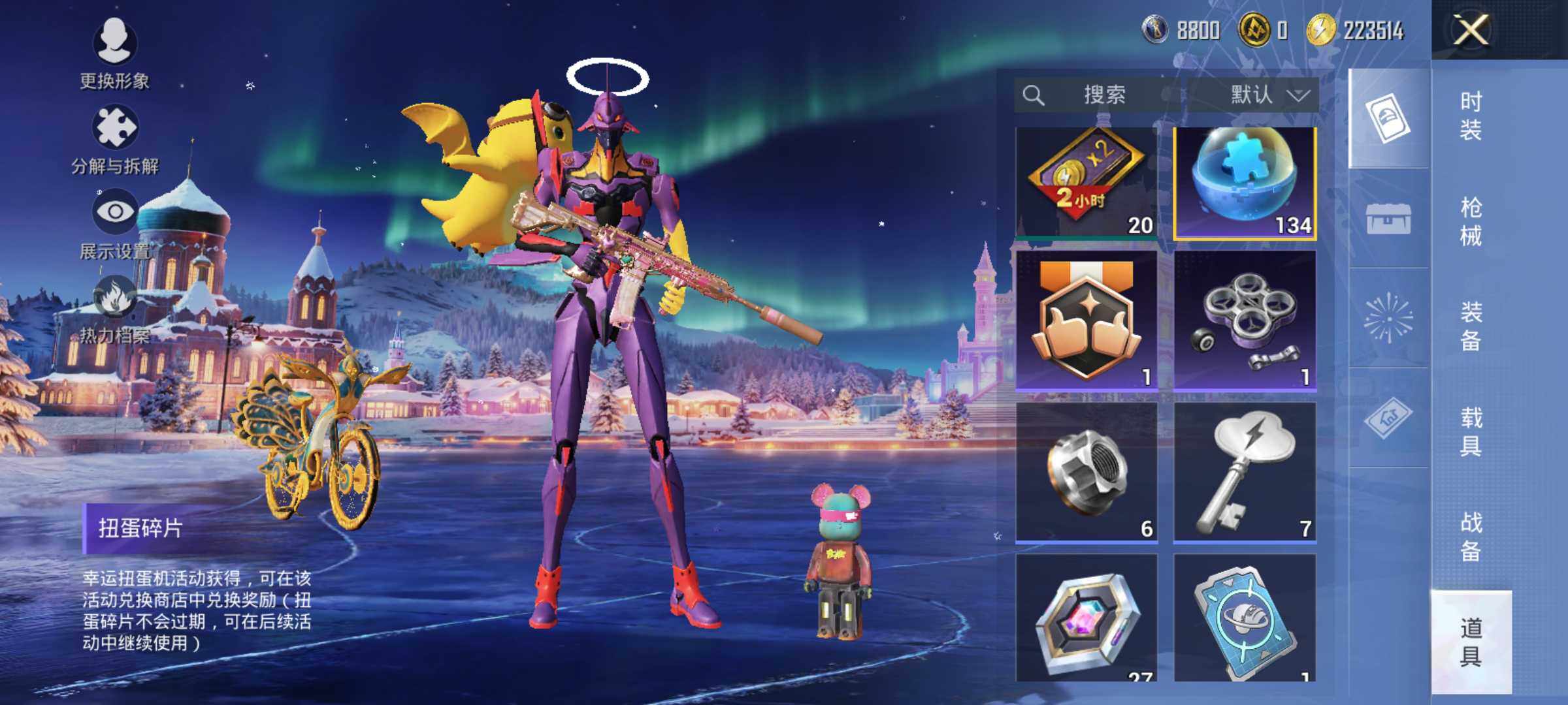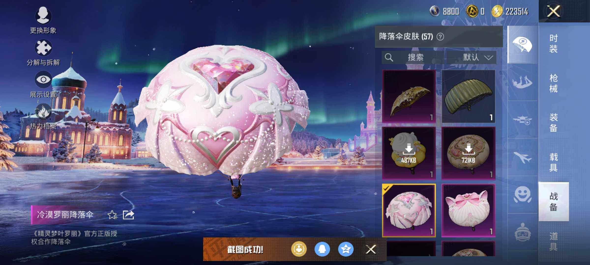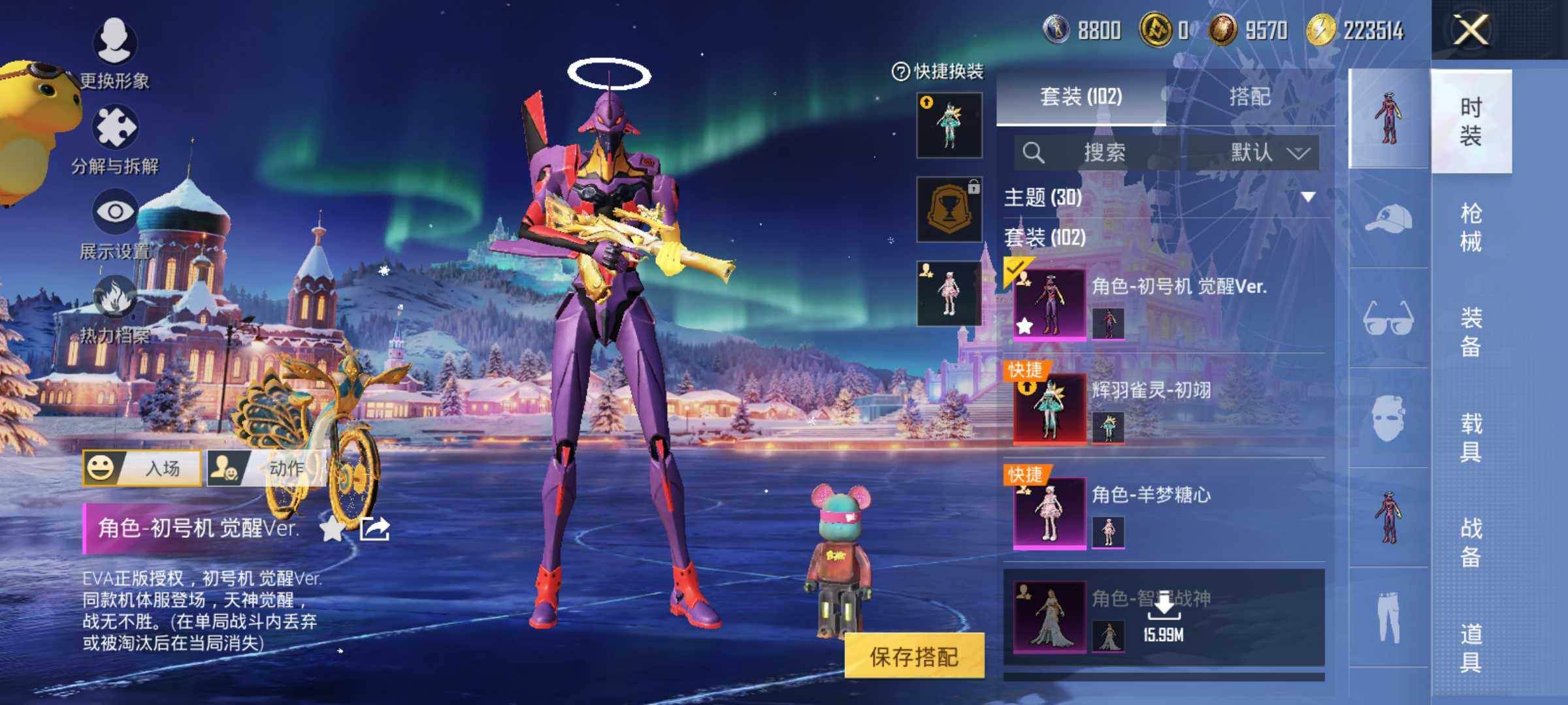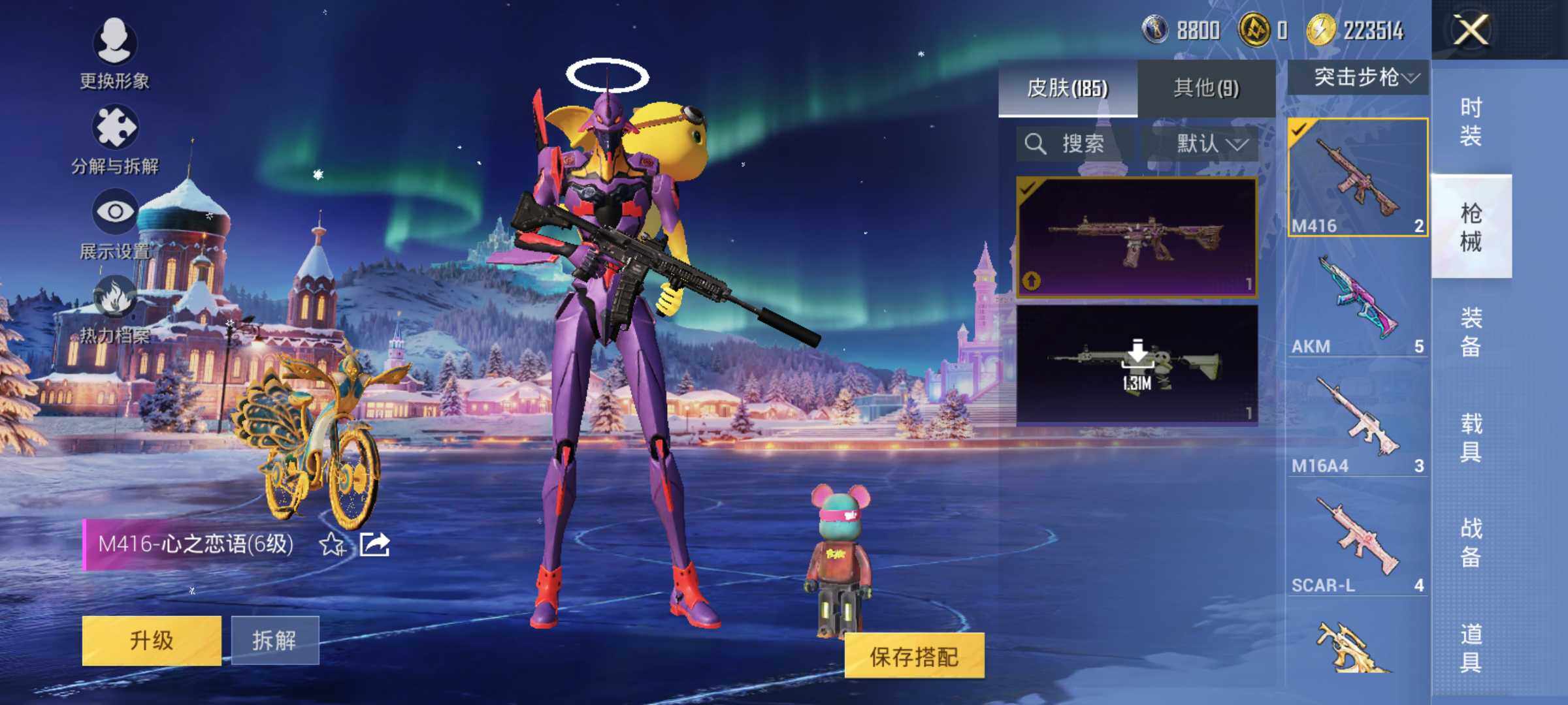 AKM-梦之光华,AKM-绿萝繁花,M416-心之恋语,GROZA-精灵之光,M762-电糖天使,P90-金丰海韵,Kar98K-巳巳如意,Kar98K-圣域龙灵,M249-彩虹甜喵,MG3-酷泡奶龙