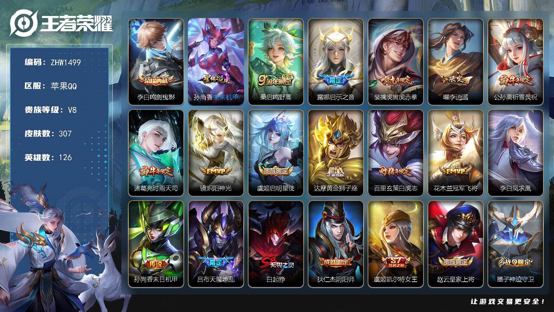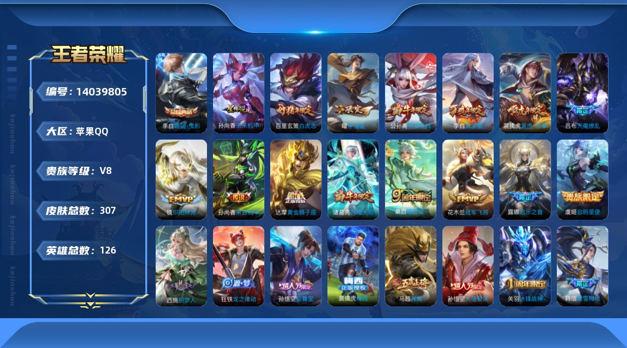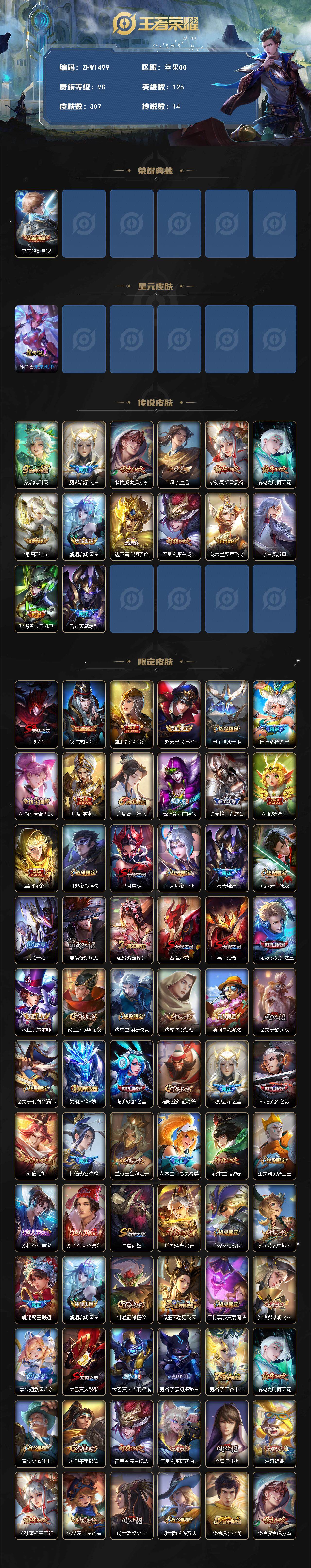 [14039805]【店主推荐捡漏号!可直接换绑】:苹果Q-V8-至尊星耀V段位-126英雄-307皮肤-1典藏-1星元-14传说-84史诗