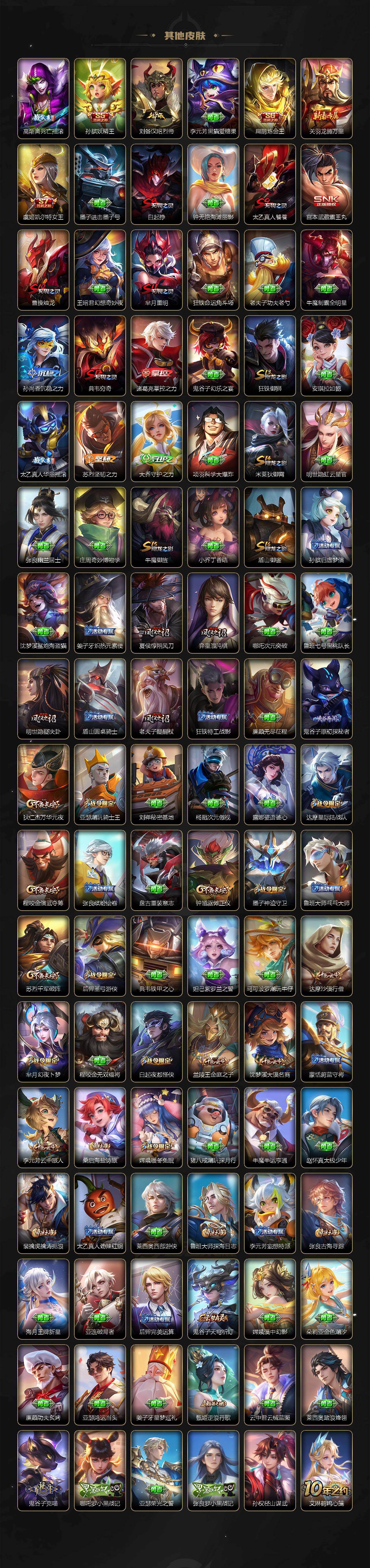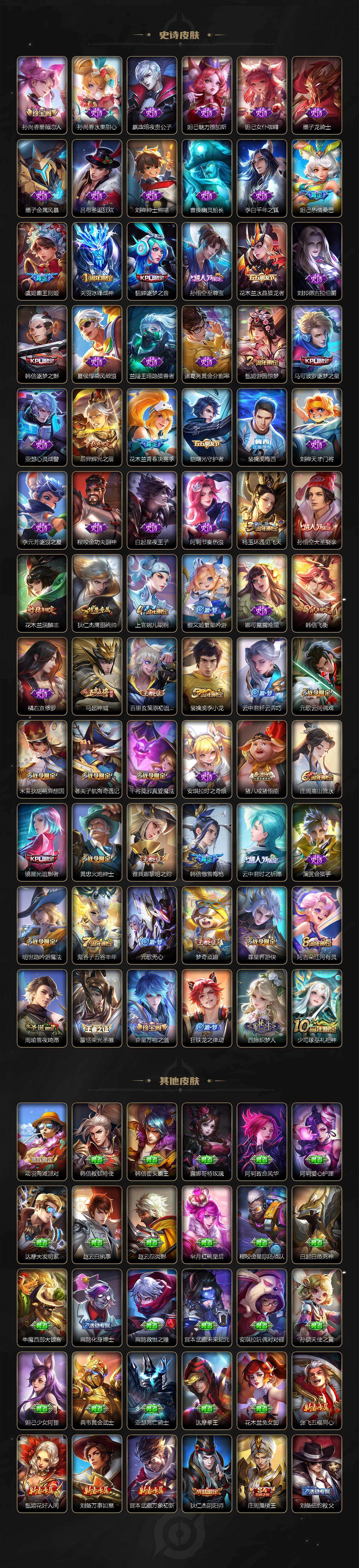 【限定皮肤】:白起狰,狄仁杰阴阳师,虞姬凯尔特女王,赵云皇家上将,墨子神迹守卫,妲己热情桑巴,孙尚香蔷薇恋人,庄周蜃楼王,庄周高山流水,高渐离死亡摇滚,钟无艳王者之锤,孙膑妖精王,扁鹊炼金王,白起夜都怪侠,芈月重明,芈月幻夜卜梦,吕布天魔缭乱,元歌云间偶戏,元歌无心,夏侯惇朔风刀,甄姬游园惊梦,曹操烛龙,典韦穷奇,马可波罗逐梦之星,狄仁杰魔术师,狄仁杰万华元夜,达摩星际陆战队,达摩沙漠行僧,项羽海滩派对,老夫子醍醐杖,老夫子航海奇遇记,关羽冰锋战神,貂蝉逐梦之音,程咬金演武夺筹,露娜启示之音,韩信逐梦之影,韩信飞衡,韩信傲雪梅枪,兰陵王金庭之子,花木兰青春决赛季,花木兰瑞麟志,亚瑟潮玩骑士王,孙悟空至尊宝,孙悟空大圣娶亲,牛魔御旌,后羿辉光之辰,后羿圣弓游侠,李元芳云中旅人,虞姬霸王别姬,虞姬启明星使,钟馗驱傩正仪,杨玉环遇见飞天,干将莫邪真爱魔法,雅典娜黎明之约,蔡文姬繁星吟游,太乙真人饕餮,太乙真人华丽摇滚,鬼谷子原初探秘者,鬼谷子五谷丰年,诸葛亮时雨天司,黄忠火炮绅士,苏烈千军破阵,百里玄策白虎志,百里玄策原初追逐者,弈星混沌棋,梦奇顽趣,公孙离祈雪灵祝,沈梦溪大漠名商,明世隐疑决卦,明世隐吟游魔法,裴擒虎李小龙,裴擒虎寅虎赤拳,裴擒虎擒涛扼浪,狂铁御狮,米莱狄御霄,米莱狄胡桃异想国,云中君纤云弄巧,云中君时之祈愿,盾山御銮,猪八戒猪悟能,上官婉儿梁祝,嫦娥暖冬兔眠,曜李逍遥 ,鲁班大师探海日志,镜匿光追影者,桑启海盐诗旅,暃星界游侠,阿古朵江河有灵,张良古海寻踪,裴擒虎梅西,蒙恬荣光圣徽,鬼谷子天穹祈灯
