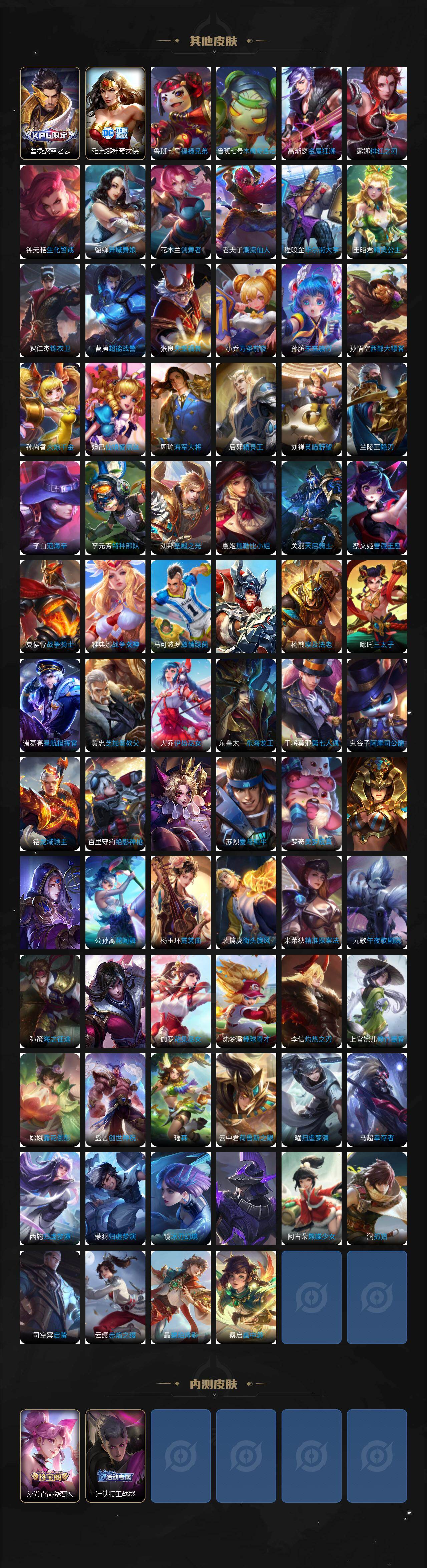 庄周蜃楼王,孙膑妖精王,扁鹊炼金王,虞姬凯尔特女王,白起狰,太乙真人饕餮,曹操烛龙,芈月重明,典韦穷奇,狂铁御狮,米莱狄御霄,牛魔御旌,盾山御銮,夏侯惇朔风刀,明世隐疑决卦,老夫子醍醐杖,鬼谷子原初探秘者,狄仁杰万华元夜,程咬金演武夺筹,钟馗驱傩正仪,苏烈千军破阵,元歌云间偶戏,弈星混沌棋,达摩沙漠行僧,兰陵王金庭之子,沈梦溪大漠名商,李元芳云中旅人,桑启海盐诗旅,裴擒虎擒涛扼浪,鲁班大师探海日志,张良古海寻踪