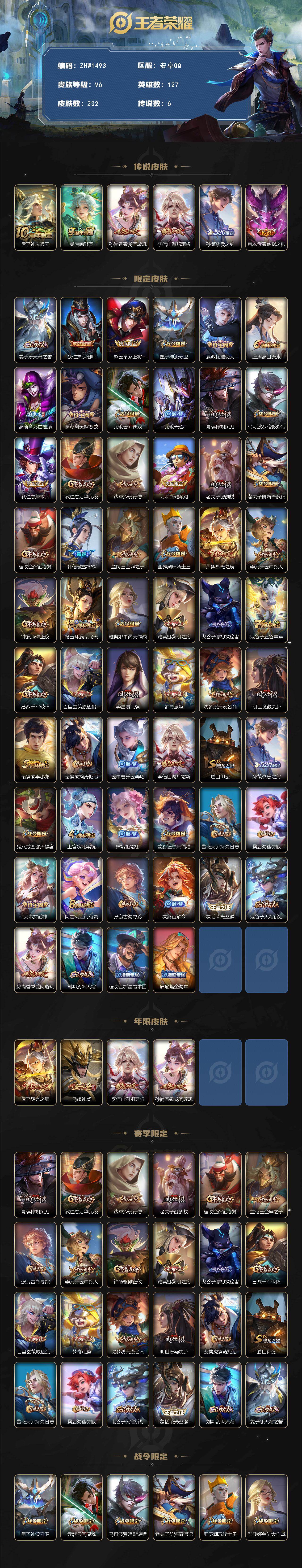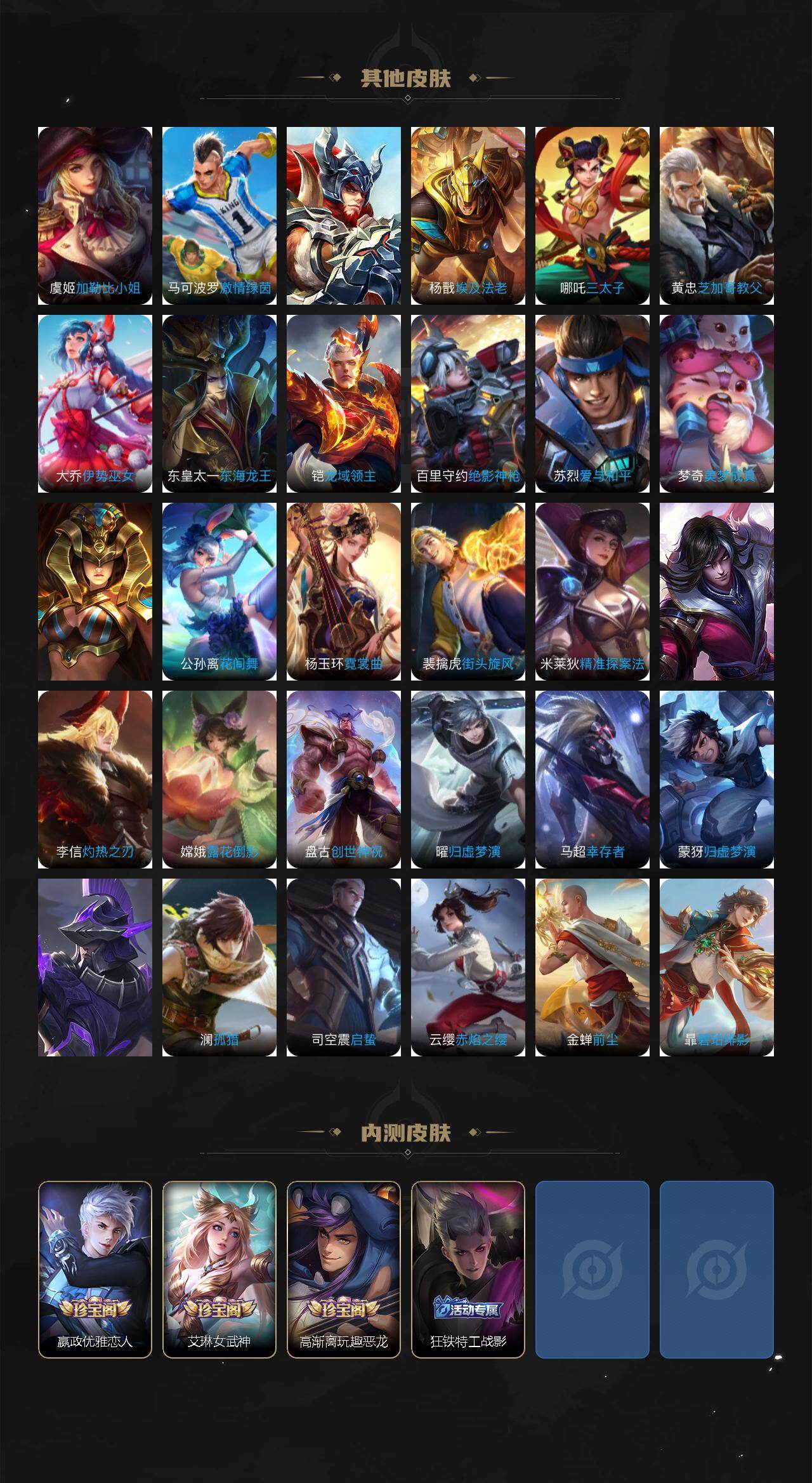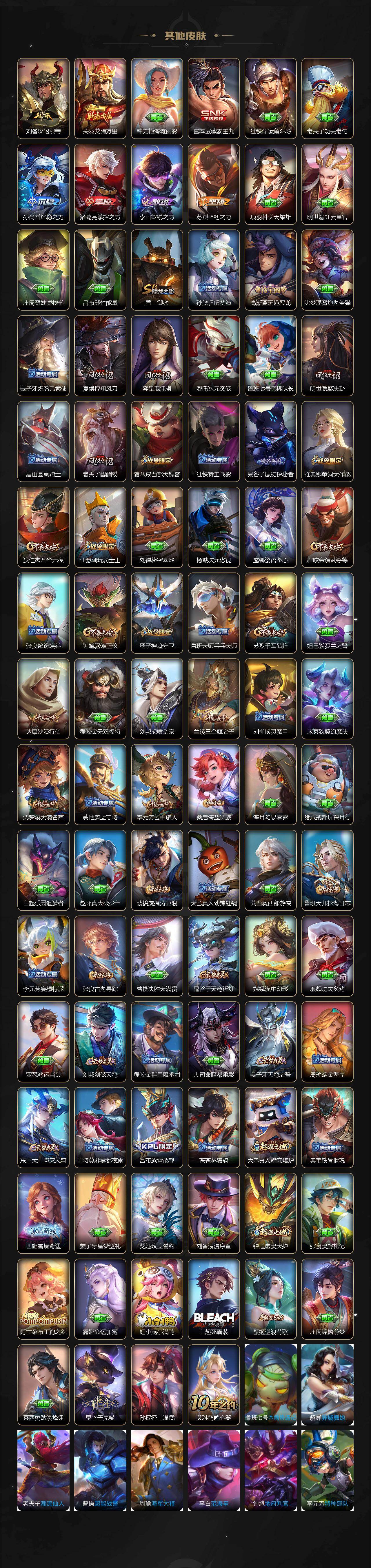 【限定皮肤】:姜子牙天穹之誓,狄仁杰阴阳师,赵云皇家上将,墨子神迹守卫,嬴政优雅恋人,庄周高山流水,高渐离死亡摇滚,高渐离玩趣恶龙,元歌云间偶戏,元歌无心,夏侯惇朔风刀,马可波罗暗影游猎,狄仁杰魔术师,狄仁杰万华元夜,达摩沙漠行僧,项羽海滩派对,老夫子醍醐杖,老夫子航海奇遇记,程咬金演武夺筹,韩信傲雪梅枪,兰陵王金庭之子,亚瑟潮玩骑士王,后羿辉光之辰,李元芳云中旅人,钟馗驱傩正仪,杨玉环遇见飞天,雅典娜单词大作战,雅典娜黎明之约,鬼谷子原初探秘者,鬼谷子五谷丰年,苏烈千军破阵,百里玄策原初追逐者,弈星混沌棋,梦奇顽趣,沈梦溪大漠名商,明世隐疑决卦,裴擒虎李小龙,裴擒虎擒涛扼浪,云中君纤云弄巧,李信山海炽霜斩,盾山御銮,孙策挚爱之约,猪八戒西部大镖客,上官婉儿梁祝,嫦娥拒霜思,蒙犽狂想玩偶喵,鲁班大师探海日志,桑启海盐诗旅,艾琳女武神,阿古朵江河有灵,张良古海寻踪,蒙犽百解令,蒙恬荣光圣徽,鬼谷子天穹祈灯,孙尚香乘龙问璇玑,刘邦剑破天穹,程咬金群星魔术团,周瑜熔金海岸