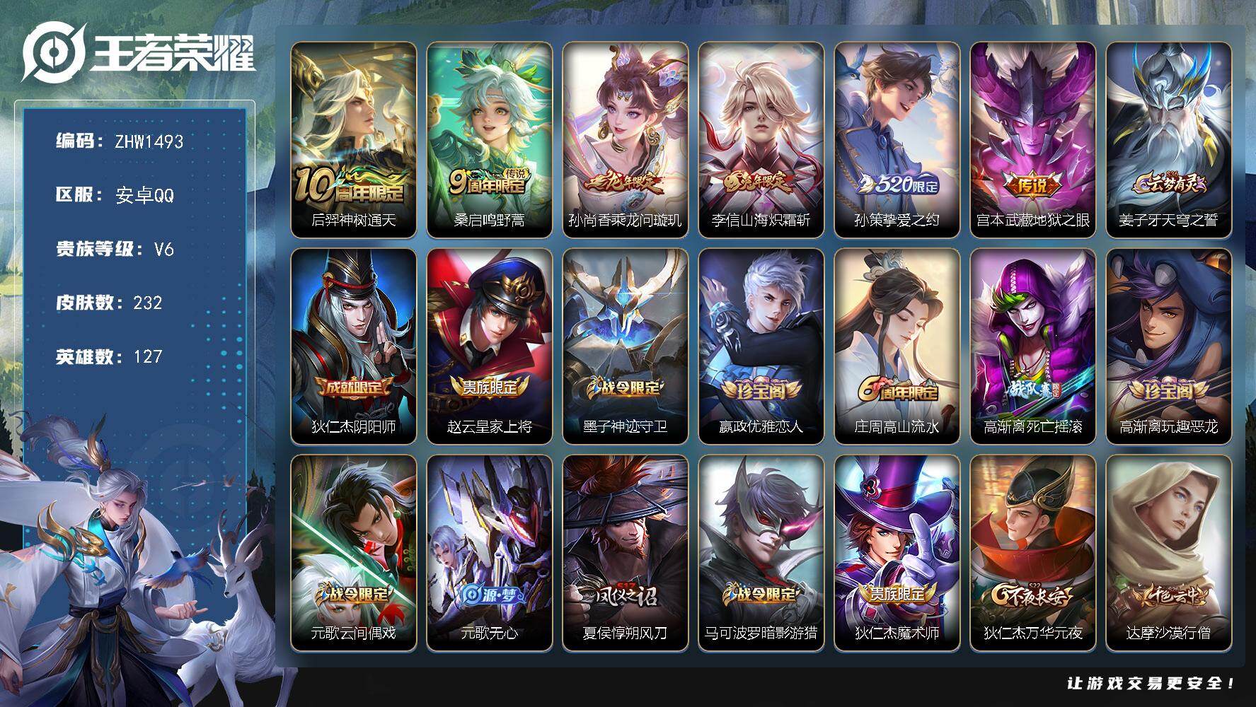 [14039898]可二次,【店主推荐捡漏号!可直接换绑安卓Q-V6-最强王者段位-127英雄-232皮肤-6传说-64史诗
