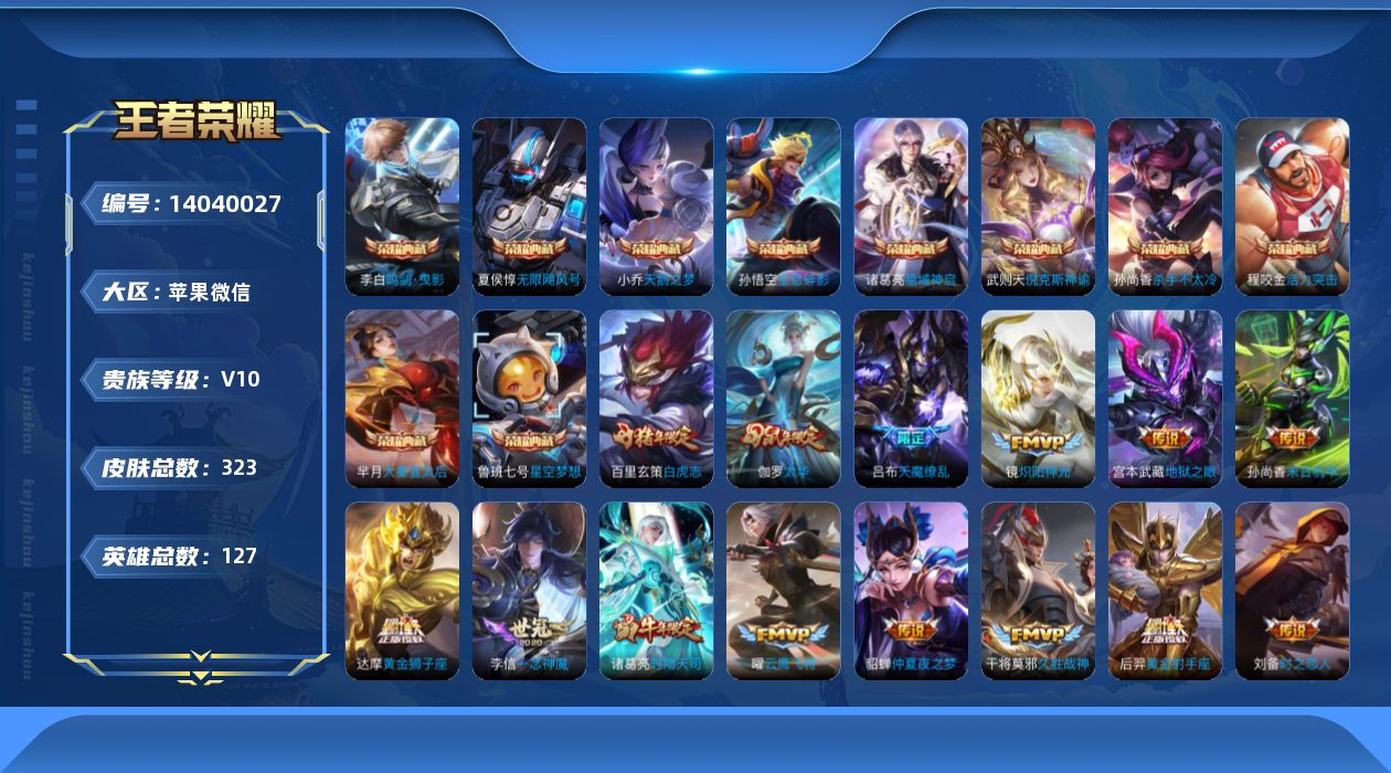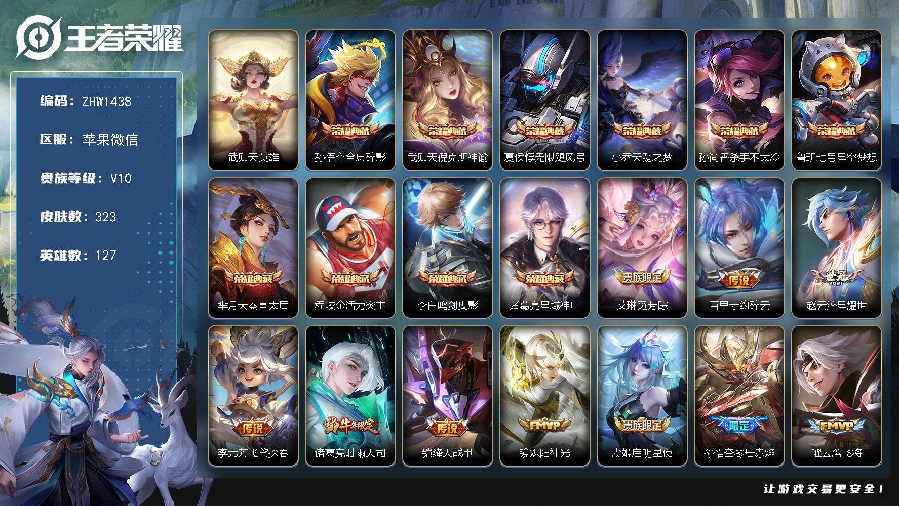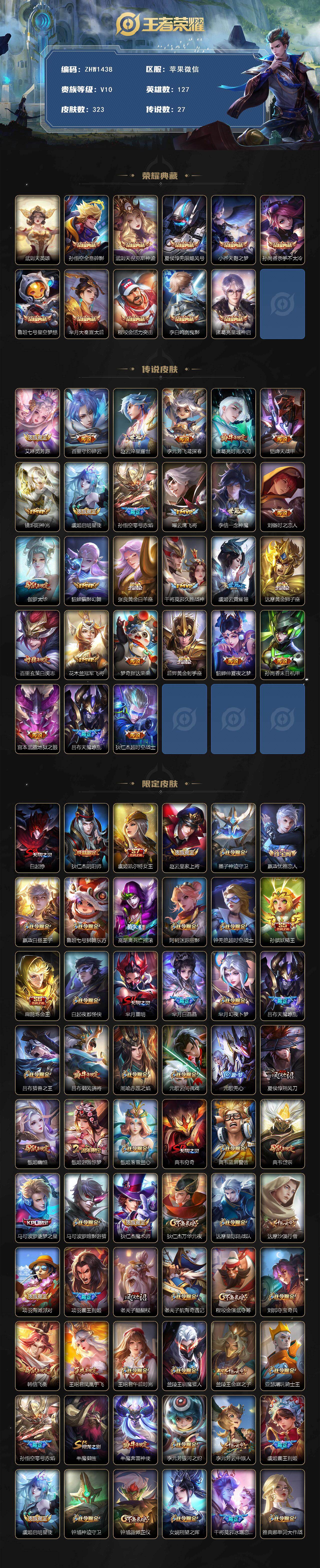 [14040027]苹果WX-V10-最强王者段位-127英雄-323皮肤-11典藏-0珍品无双-0无双-0珍品传说-27传说-89史诗-3星传说