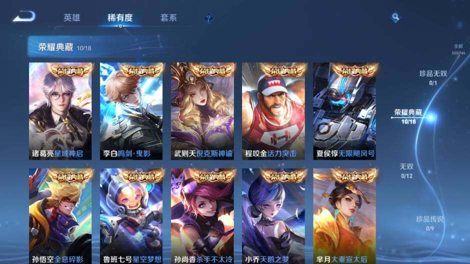 【荣耀典藏】:武则天英雄,孙悟空全息碎影,武则天倪克斯神谕,夏侯惇无限飓风号,小乔天鹅之梦,孙尚香杀手不太冷,鲁班七号星空梦想,芈月大秦宣太后,程咬金活力突击,李白鸣剑曳影,诸葛亮星域神启