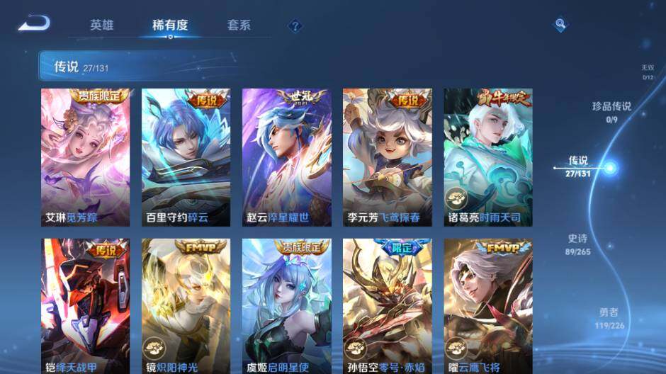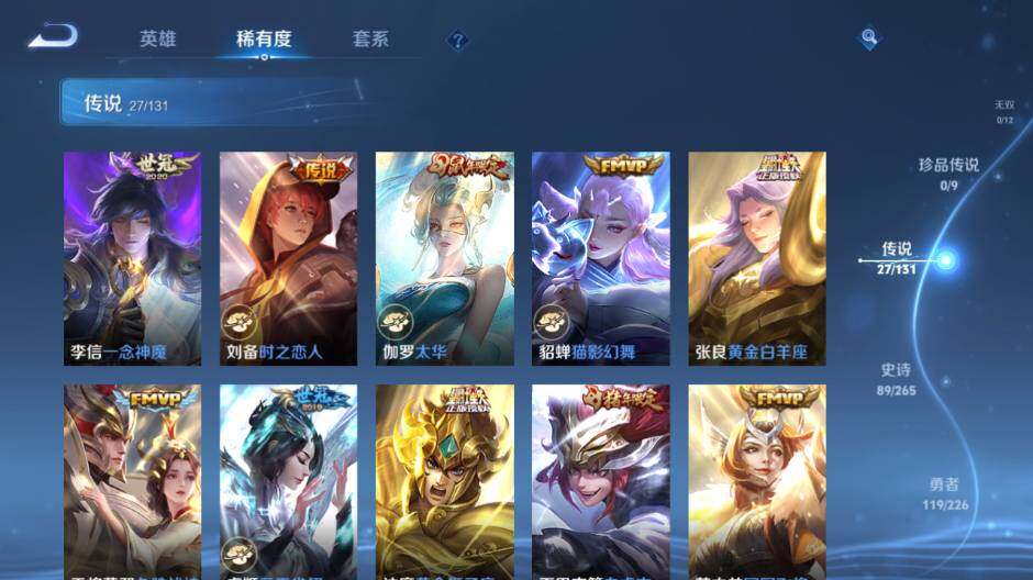 - PX_2096132-15 安卓QQ/无双王者/341皮肤/124英雄/1典藏/0珍品无双/0无双/4珍品传说/33传说/83史诗/8稀有英雄 【4 珍品传说】黑崎一护 宫本武藏,怪盗基德 马可波罗,时之奇旅 孙策,兔狲·蓬尾 张飞, 【1 典藏皮肤】银白咏叹调 铠, 【33 传说皮肤】启明星使 虞姬,逐花归海 澜,云鹰飞将 曜,齐天大圣 孙悟空,浮生妄 夏洛特,落雪白狼 亚连,惊梅引 宫本武藏,