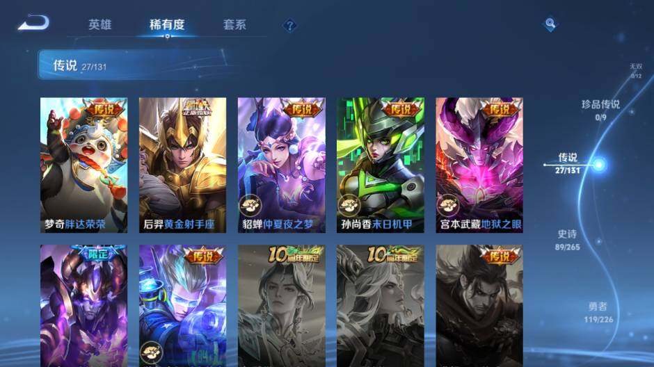 【传说皮肤】:艾琳觅芳踪,百里守约碎云,赵云淬星耀世,李元芳飞鸢探春,诸葛亮时雨天司,铠绛天战甲,镜炽阳神光,虞姬启明星使,孙悟空零号赤焰,曜云鹰飞将,李信一念神魔,刘备时之恋人,伽罗太华,貂蝉猫影幻舞,张良黄金白羊座,干将莫邪久胜战神,虞姬云霓雀翎,达摩黄金狮子座,百里玄策白虎志,花木兰冠军飞将,梦奇胖达荣荣,后羿黄金射手座,貂蝉仲夏夜之梦,孙尚香末日机甲,宫本武藏地狱之眼,吕布天魔缭乱,狄仁杰超时空战士