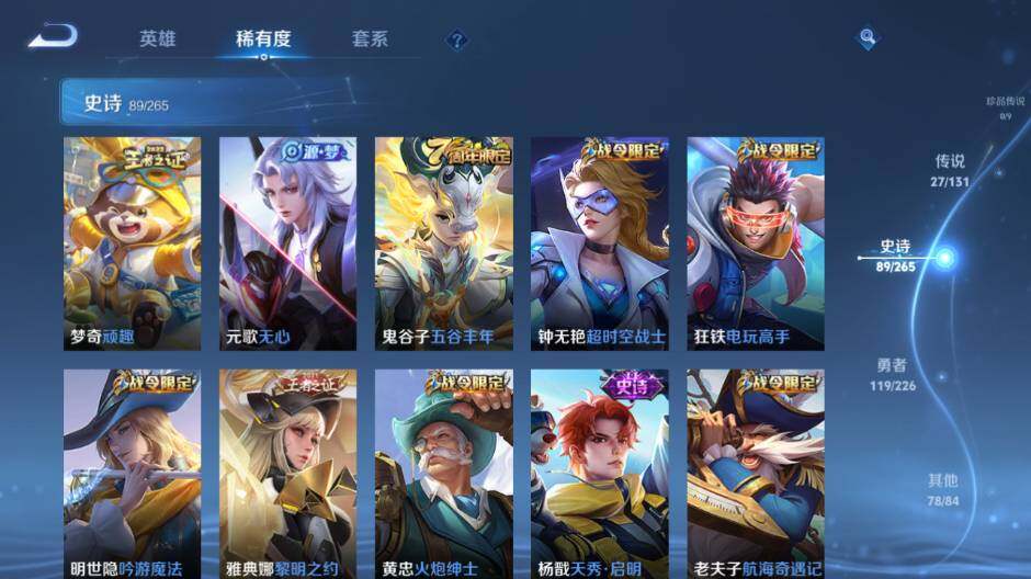 孙膑妖精王,扁鹊炼金王,虞姬凯尔特女王,白起狰,太乙真人饕餮,芈月重明,典韦穷奇,狂铁御狮,米莱狄御霄,牛魔御旌,盾山御銮,夏侯惇朔风刀,明世隐疑决卦,老夫子醍醐杖,鬼谷子原初探秘者,狄仁杰万华元夜,程咬金演武夺筹,钟馗驱傩正仪,苏烈千军破阵,吕布猎兽之王,嬴政白昼王子,女娲朔望之晖,典韦蓝屏警告,钟馗神迹守卫,鲁班七号狮舞东方,沈梦溪星空之诺,李元芳银河之约,刘邦夺宝奇兵,马可波罗暗影游猎,蒙犽狂想玩偶喵,元歌云间偶戏,弈星混沌棋,达摩沙漠行僧,兰陵王金庭之子,沈梦溪大漠名商,李元芳云中旅人,桑启海盐诗旅,裴擒虎擒涛扼浪,鲁班大师探海日志,张良古海寻踪