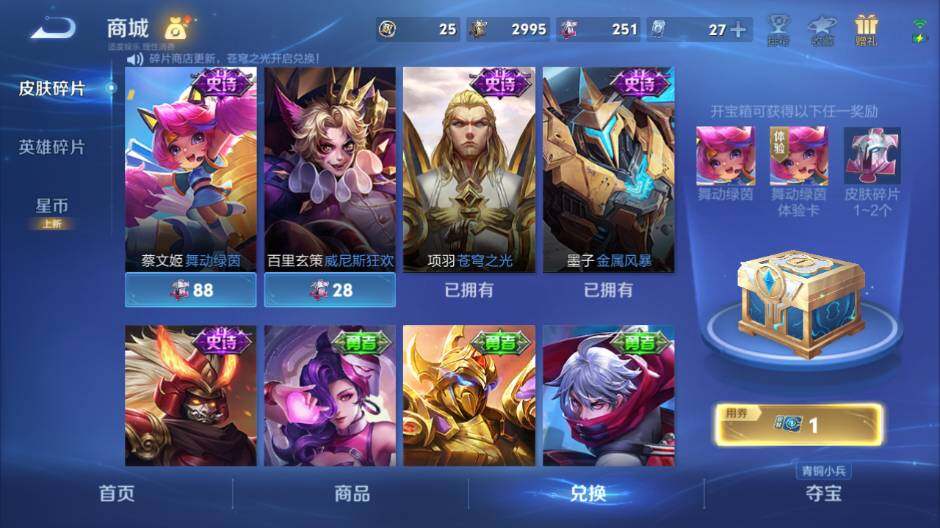 达摩黄金狮子座,张良黄金白羊座,干将莫邪久胜战神,铠绛天战甲,貂蝉猫影幻舞,曜云鹰飞将,镜炽阳神光,虞姬云霓雀翎,李信一念神魔,赵云淬星耀世,刘备时之恋人,孙悟空零号·赤焰,李元芳飞鸢探春,百里守约碎云,艾琳觅芳踪