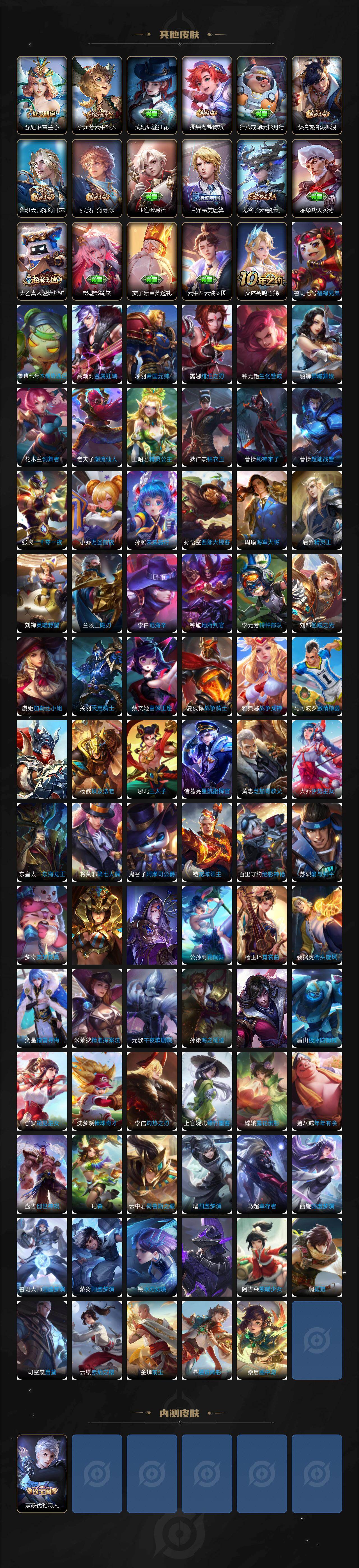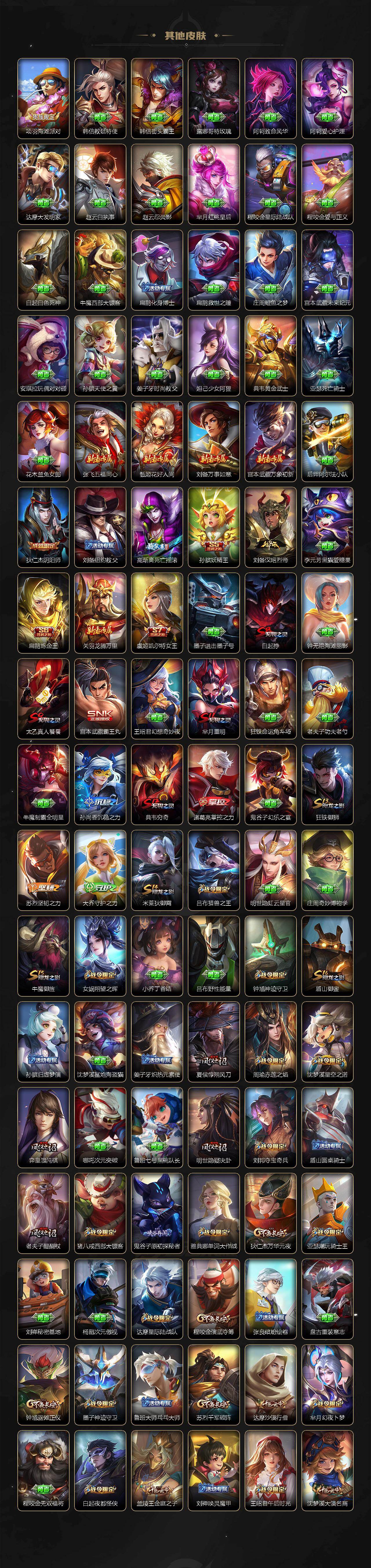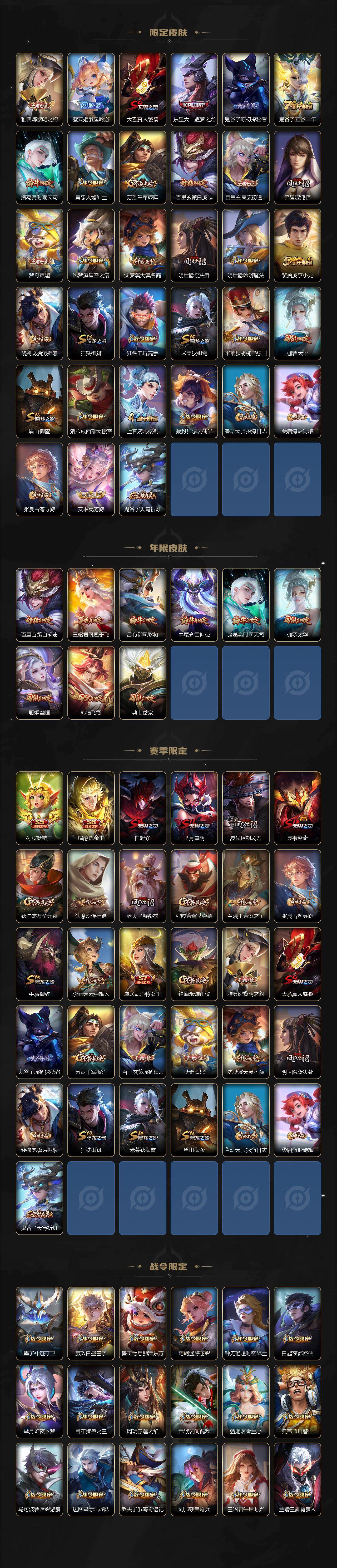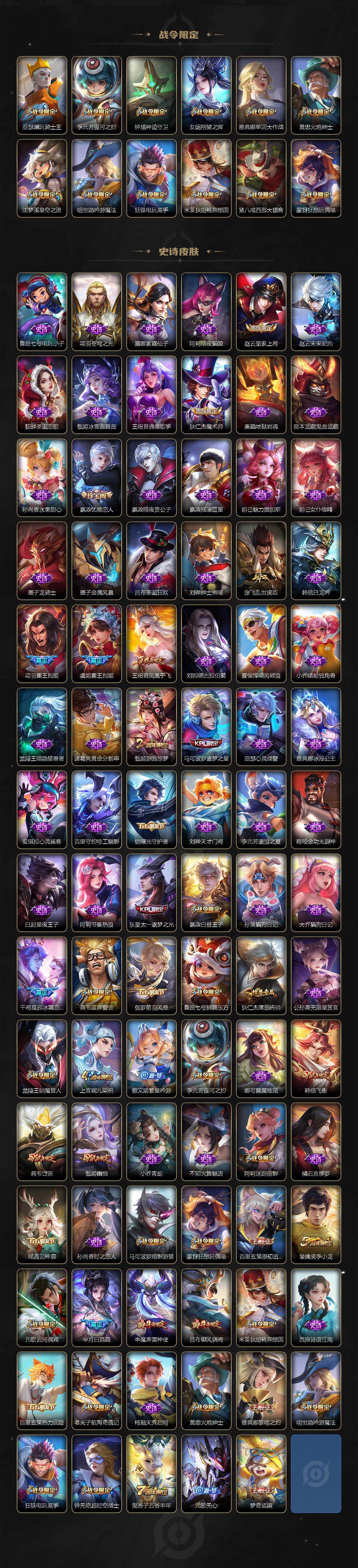 【限定皮肤】:白起狰,狄仁杰阴阳师,虞姬凯尔特女王,赵云皇家上将,墨子神迹守卫,嬴政优雅恋人,嬴政白昼王子,鲁班七号狮舞东方,高渐离死亡摇滚,阿轲迷踪丽影,钟无艳超时空战士,孙膑妖精王,扁鹊炼金王,白起夜都怪侠,芈月重明,芈月白晶晶,芈月幻夜卜梦,吕布天魔缭乱,吕布猎兽之王,吕布御风骁将,周瑜赤莲之焰,元歌云间偶戏,元歌无心,夏侯惇朔风刀,甄姬幽恒,甄姬游园惊梦,甄姬落雪兰心,典韦穷奇,典韦蓝屏警告,典韦岱宗,马可波罗逐梦之星,马可波罗暗影游猎,狄仁杰魔术师,狄仁杰万华元夜,达摩星际陆战队,达摩沙漠行僧,项羽海滩派对,项羽霸王别姬,老夫子醍醐杖,老夫子航海奇遇记,程咬金演武夺筹,刘邦夺宝奇兵,韩信飞衡,王昭君凤凰于飞,王昭君午后时光,兰陵王驯魔猎人,兰陵王金庭之子,亚瑟潮玩骑士王,孙悟空零号赤焰,牛魔御旌,牛魔奔雷神使,李元芳银河之约,李元芳云中旅人,虞姬霸王别姬,虞姬启明星使,钟馗神迹守卫,钟馗驱傩正仪,女娲朔望之晖,干将莫邪冰霜恋舞曲,雅典娜单词大作战,雅典娜黎明之约,蔡文姬繁星吟游,太乙真人饕餮,东皇太一逐梦之光,鬼谷子原初探秘者,鬼谷子五谷丰年,诸葛亮时雨天司,黄忠火炮绅士,苏烈千军破阵,百里玄策白虎志,百里玄策原初追逐者,弈星混沌棋,梦奇顽趣,沈梦溪星空之诺,沈梦溪大漠名商,明世隐疑决卦,明世隐吟游魔法,裴擒虎李小龙,裴擒虎擒涛扼浪,狂铁御狮,狂铁电玩高手,米莱狄御霄,米莱狄胡桃异想国,伽罗太华,盾山御銮,猪八戒西部