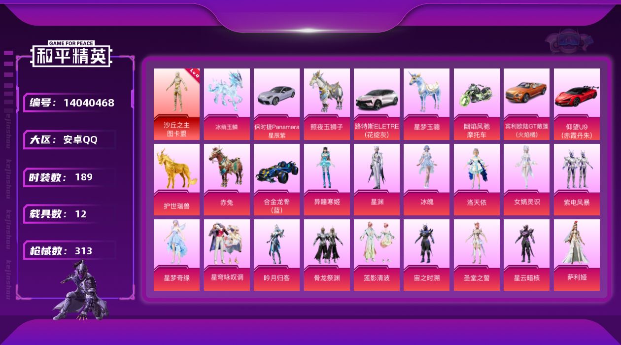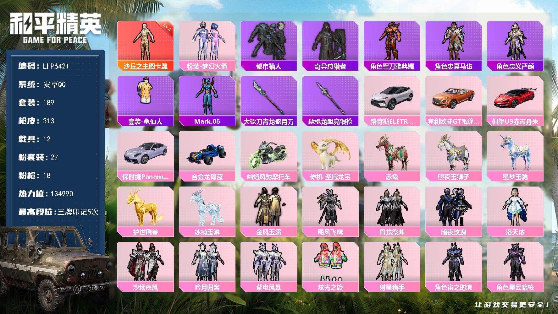 - [15154540]【店主推荐捡漏号!可直接换绑】安卓 手Q-2神装-7粉装-15特效枪-8载具-6粉色飞行器-10.1w热力值-17王牌印记-213套装-274枪皮【红色神装等级】:灵猫魔法师-塞维尔(一级),辉羽雀灵-初翊(三级)【热门品类】:粉装-缤纷油彩,绝对防御上衣,套装-奇异狩猎者,套装-忍者信条,套装-SS1特训,套装-龟仙人,套装-潮萌小黄鸭,套装-粉红小猪,套装-萌熊伴侣,小恶魔头饰,熔岩游骑兵面罩【粉色载具】:特斯拉Roadster(沁心粉),玛莎拉蒂Ghibli(金),宝马i8(离子银),保时捷911 敞篷版(星珀红),合金龙骨(绿),空客H135-蔚蓝之翼,星梦玉骢,辉羽雀灵自行车【粉色套装】:粉装-天使彩虹糖,粉装-缤纷油彩,粉装-甜蜜誓约,粉装-极致幻想,粉装-蓝莓炮弹,角色-智耀战神,角色-冷漠罗丽【粉色枪皮等级】:AKM-炫紫旋律(七级),SCAR-L-梦幻火箭(五级),M416-五爪金龙(一级),M416-心之恋语(七级),GROZA-镜光银凌(五级),AUG-暖羊咩咩(五级),M762-甜蜜誓约(七级),UMP45-量子极限(五级),Kar98K-巳巳如意(五级),Mk14-甜梦熊击(五级),AMR-智耀战神(五级),DP-28-豹影疾电(五级),MG3-辉羽雀灵(三级),MG-36-幻彩电音(二级),烟雾弹-甜梦果泡(五级)【粉色飞行器】:梦幻火箭飞行器,圣域金龙飞行器,雀灵庇佑飞行器,灵猫魔法师飞行器