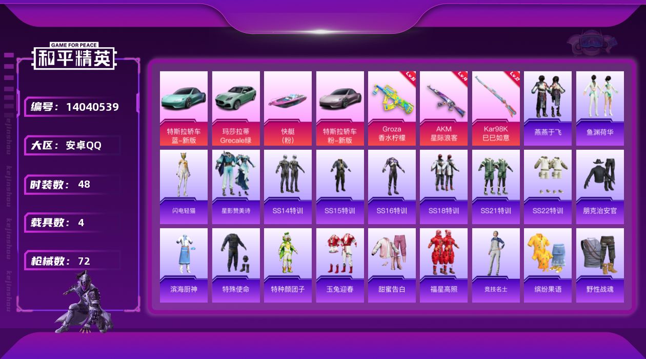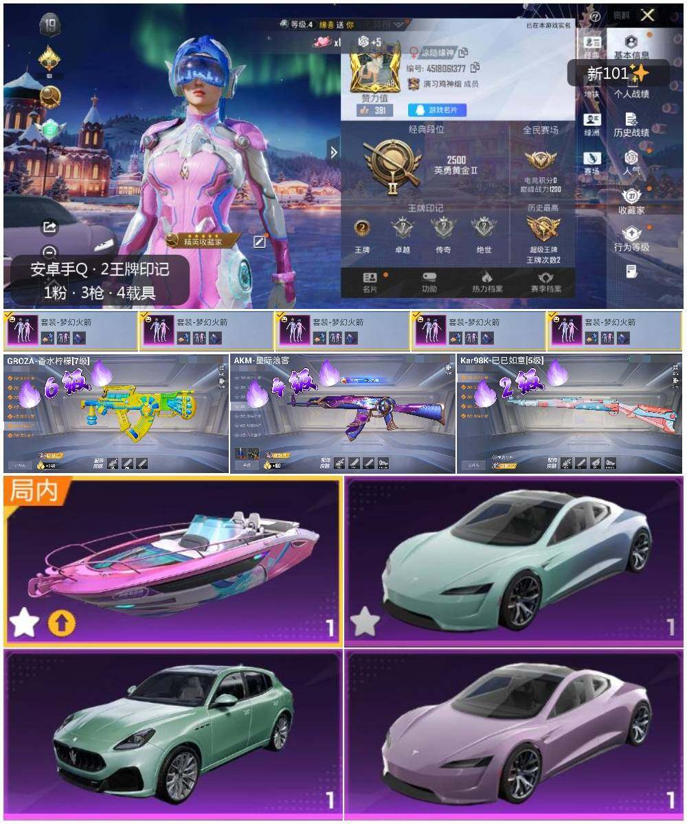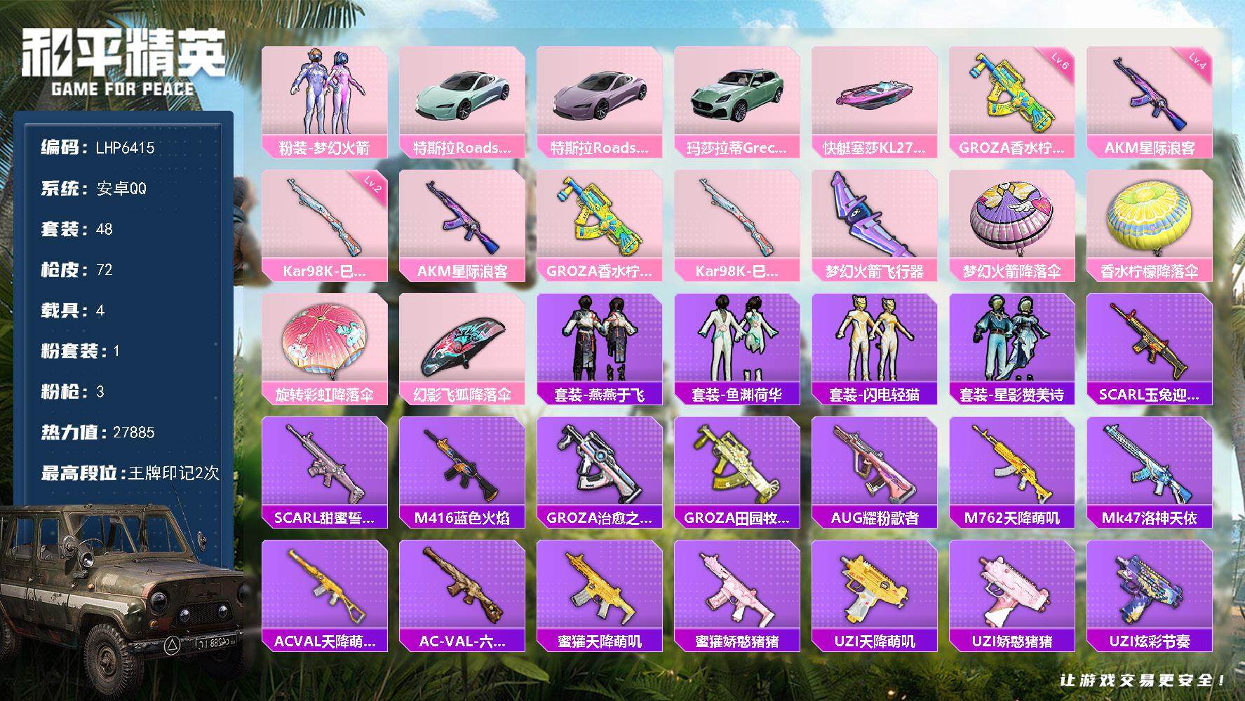 [14040539]【店主推荐捡漏号!可直接换绑】 安卓 手Q-1粉装-3特效枪-4载具-1粉色飞行器-2.7w热力值-2王牌印记-48套装-72枪皮【热门品类】:粉装-梦幻火箭【粉色载具】:特斯拉Roadster(水滴蓝),特斯拉Roadster(沁心粉),玛莎拉蒂Grecale(薄荷绿),快艇-塞莎KL27(霓虹粉)【粉色套装】:粉装-梦幻火箭【粉色枪皮等级】:AKM-星际浪客(四级),GROZA-香水柠檬(六级),Kar98K-巳巳如意(二级)【粉色飞行器】:梦幻火箭飞行器