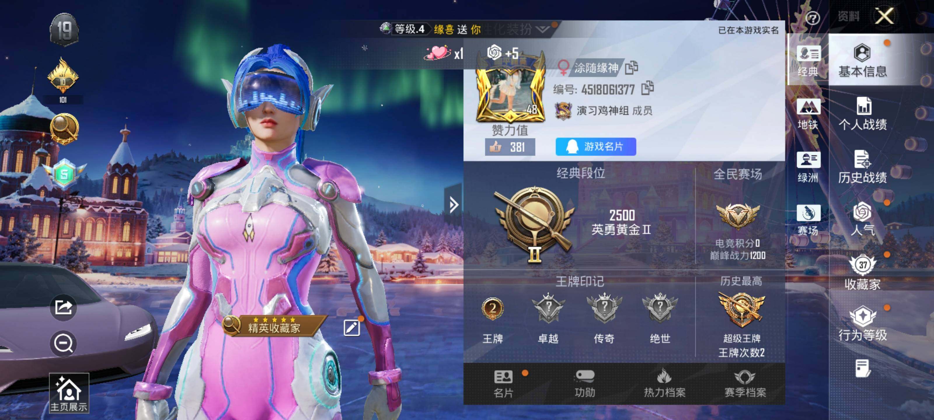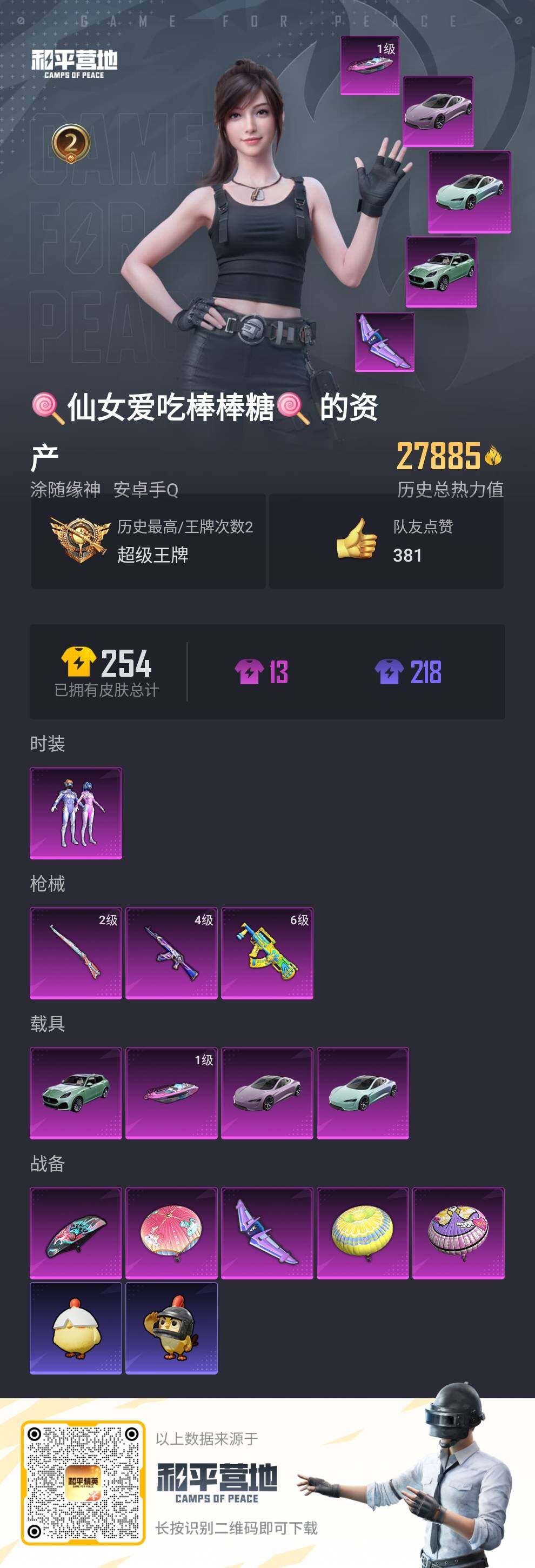 - [10598019]实名: 可修改 时装数: 182 载具数: 2 枪械数: 44 战备数: 36 热门装扮: 梦幻火箭(新101),宝贝奶油派,天使彩虹糖,甜蜜誓约,垂柳戏鸭 载具: 路特斯ELETRE(冰川蓝),玛莎拉蒂MC20(星石白) 稀有枪皮: SCAR-L梦幻火箭,M16A4垂柳戏鸭,SCAR-L-锦绣绵绵,Kar98K-巳巳如意