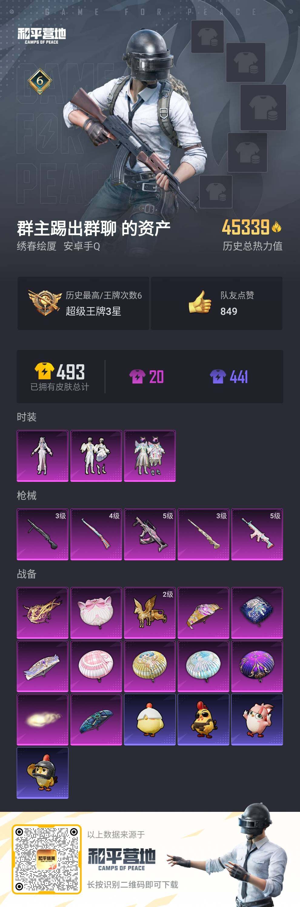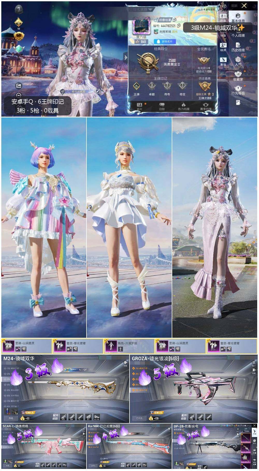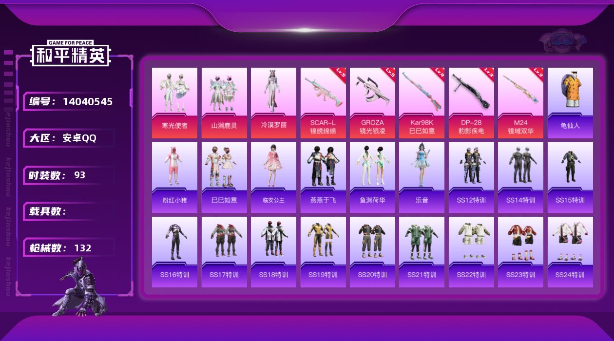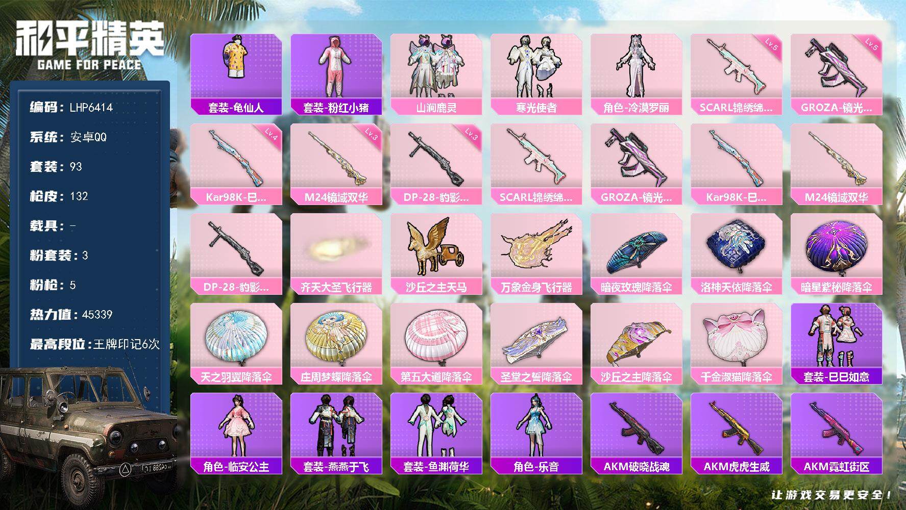 [14040545]可二次【店主推荐捡漏号!可直接换绑】 安卓 手Q-3粉装-5特效枪-3粉色飞行器-4.5w热力值-6王牌印记-93套装-132枪皮【热门品类】:套装-龟仙人,套装-粉红小猪【粉色套装】:粉装-山涧鹿灵,粉装-寒光使者,角色-冷漠罗丽【粉色枪皮等级】:SCAR-L-锦绣绵绵(五级),GROZA-镜光银凌(五级),Kar98K-巳巳如意(四级),M24-镜域双华(三级),DP-28-豹影疾电(三级)【粉色飞行器】:齐天大圣飞行器,沙丘之主天马,万象金身飞行器