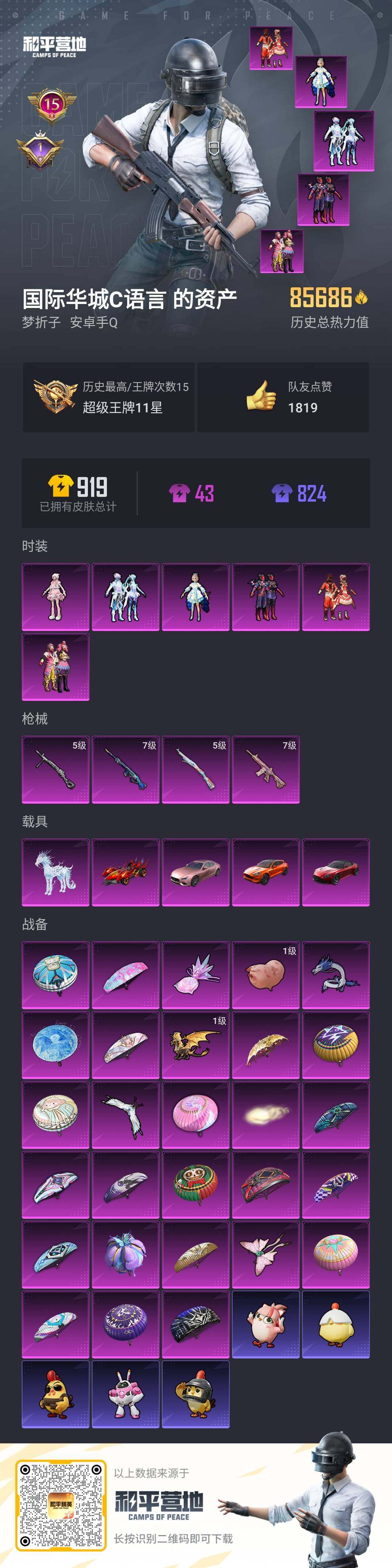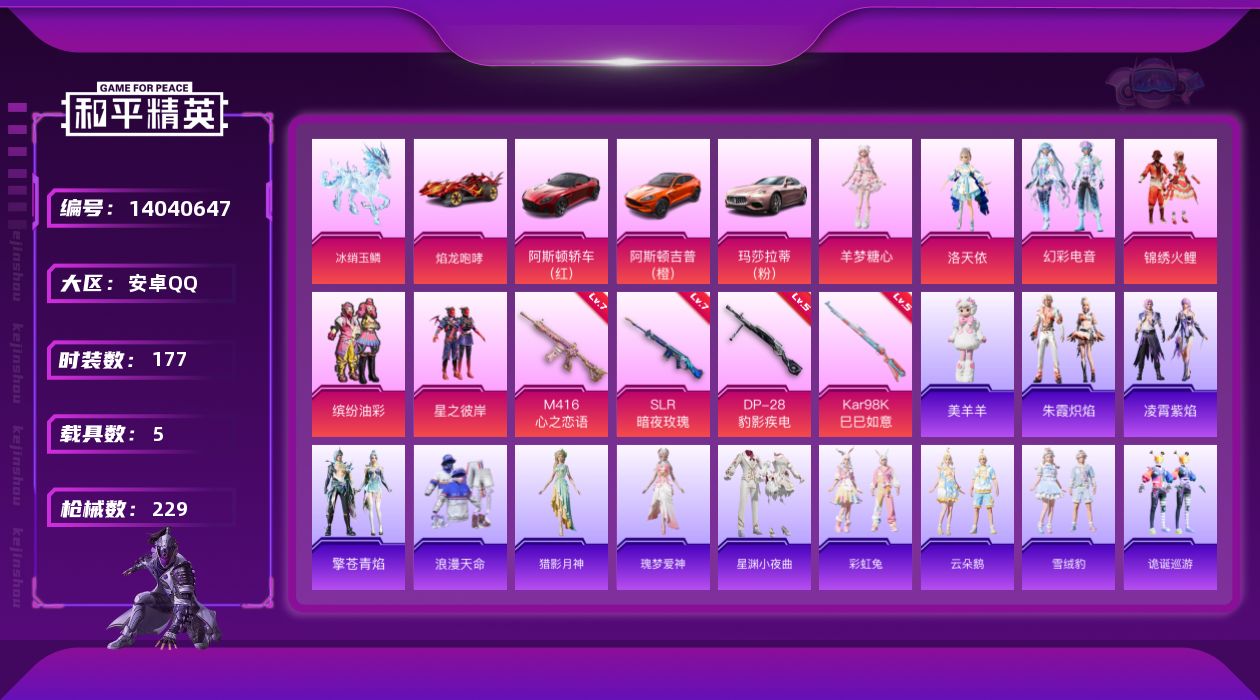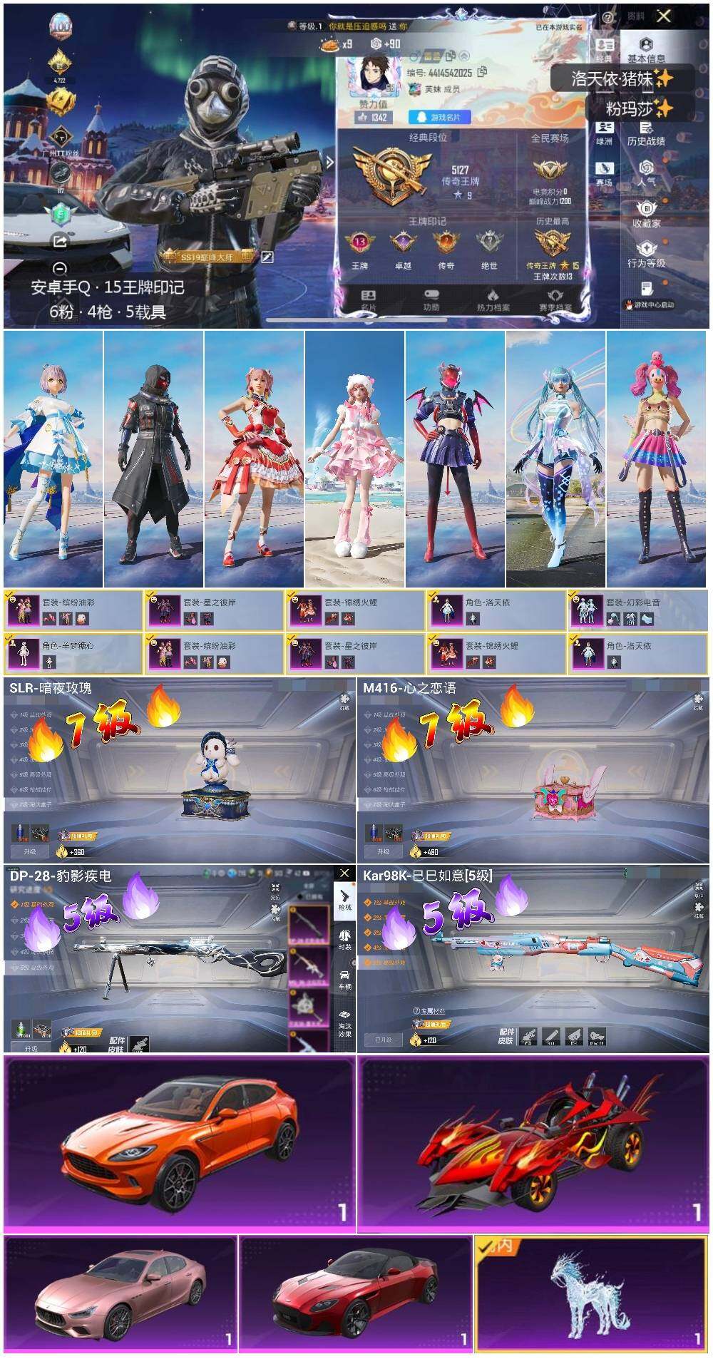 [14040647]【店主推荐捡漏号!可直接换绑】/素材身法号 安卓 手Q-6粉装-4特效枪-5载具-7粉色飞行器-8.5w热力值-15王牌印记-177套装-229枪皮【热门品类】:粉装-缤纷油彩,套装-浪漫天命,套装-奇异狩猎者【粉色载具】:阿斯顿马丁DBS(红),阿斯顿马丁DBX(橙),玛莎拉蒂Ghibli(粉),焰龙咆哮,冰绡玉鳞【粉色套装】:粉装-缤纷油彩,粉装-锦绣火鲤,粉装-星之彼岸,角色-洛天依,粉装-幻彩电音,角色-羊梦糖心【粉色枪皮等级】:M416-心之恋语(七级),Kar98K-巳巳如意(五级),SLR-暗夜玫瑰(七级),DP-28-豹影疾电(五级)【粉色飞行器】:心之恋语飞行翼,齐天大圣飞行器,天之羽翼飞行器,圣域金龙飞行器,飞天猪飞行器,灵珠游龙飞行器