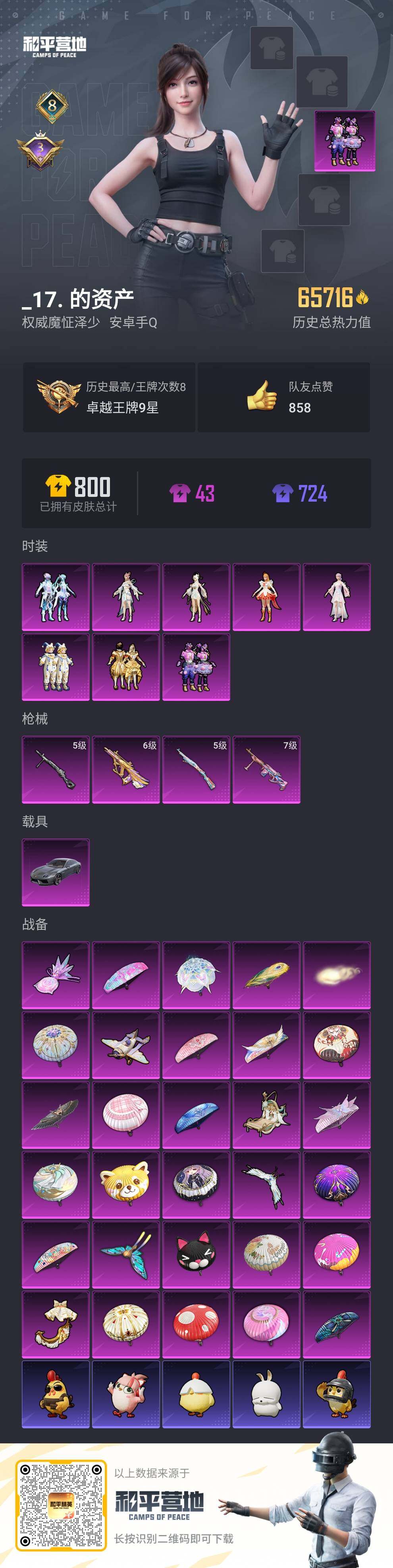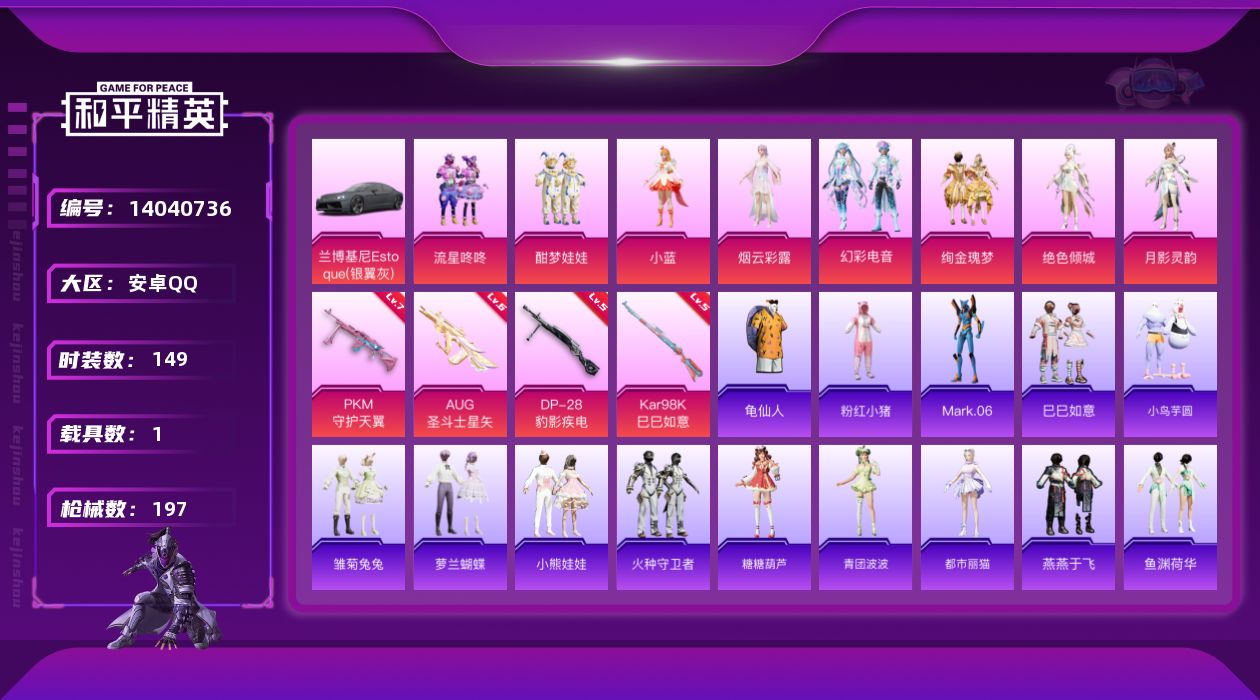 - PX_2095370- 安卓手Q-9王牌印记-11粉装-7特效枪-0载具-62595热力值-125套装-175枪皮-1卓越印记-0传奇印记 【11粉装】,梦幻火箭,星穹咏叹调,草莓生巧,千金淑猫,筑梦精灵,酣梦娃娃,赤焰黑爵,暗翼战神,天之羽翼,星夜魔法师,金丰海韵 【7特效枪】GROZA-镜光银凌-5级 M762-青锋波束-5级 Kar98K-巳巳如意-5级 M24-魔法神域-7级 P90-金丰