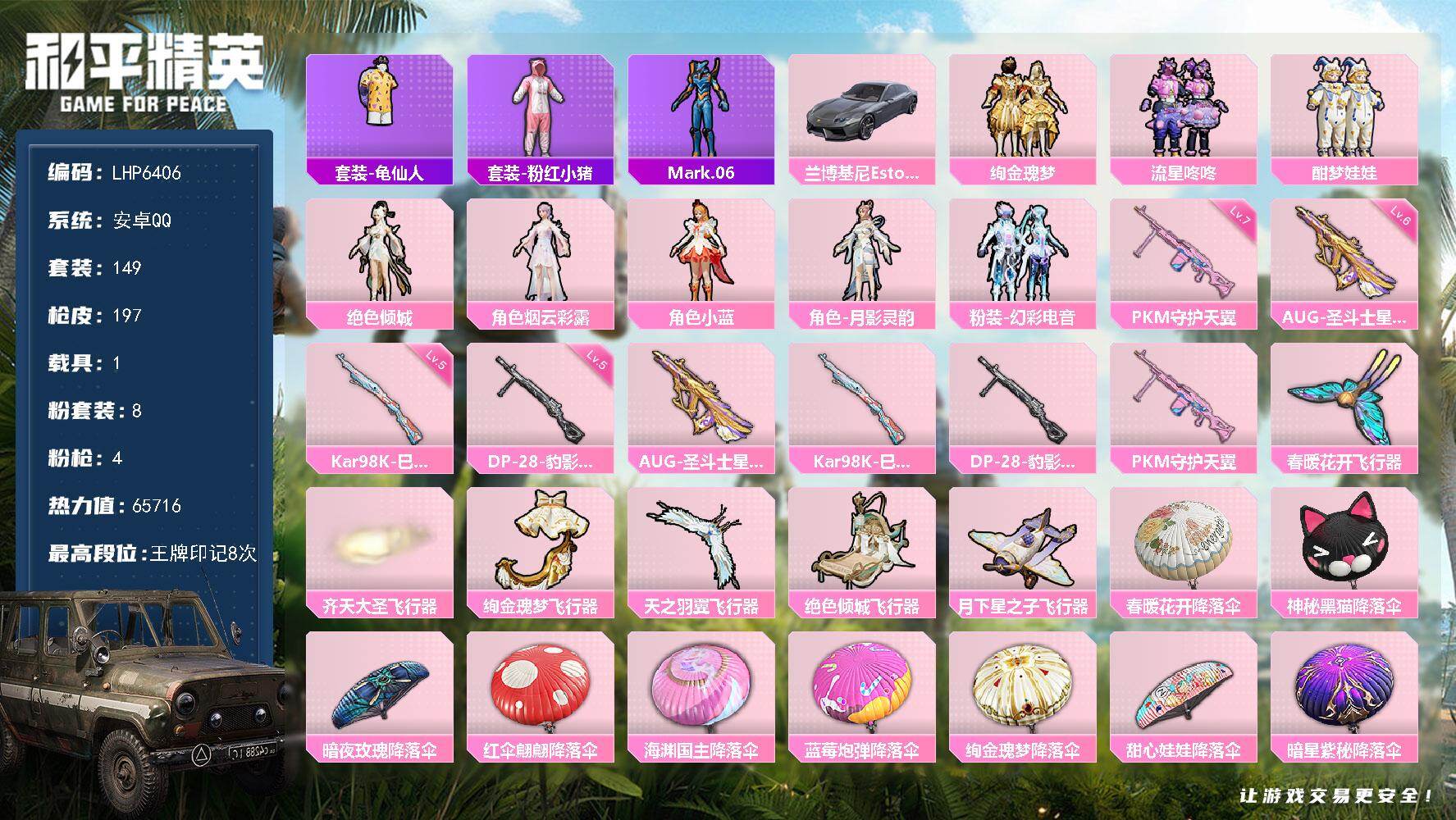 [14040736]可二次【店主推荐捡漏号!可直接换绑】 安卓 手Q-8粉装-4特效枪-1载具-7粉色飞行器-6.5w热力值-8王牌印记-149套装-197枪皮【热门品类】:套装-龟仙人,套装-粉红小猪,角色-Mark.06【粉色载具】:兰博基尼Estoque(银翼灰)【粉色套装】:粉装-绚金瑰梦,粉装-流星咚咚,粉装-酣梦娃娃,角色-绝色倾城,角色-烟云彩露,角色-小蓝,角色-月影灵韵,粉装-幻彩电音【粉色枪皮等级】:AUG-圣斗士星矢(六级),Kar98K-巳巳如意(五级),DP-28-豹影疾电(五级),PKM-守护天翼(七级)【粉色飞行器】:春暖花开飞行器,齐天大圣飞行器,绚金瑰梦飞行器,天之羽翼飞行器,绝色倾城飞行器,月下星之子飞行器