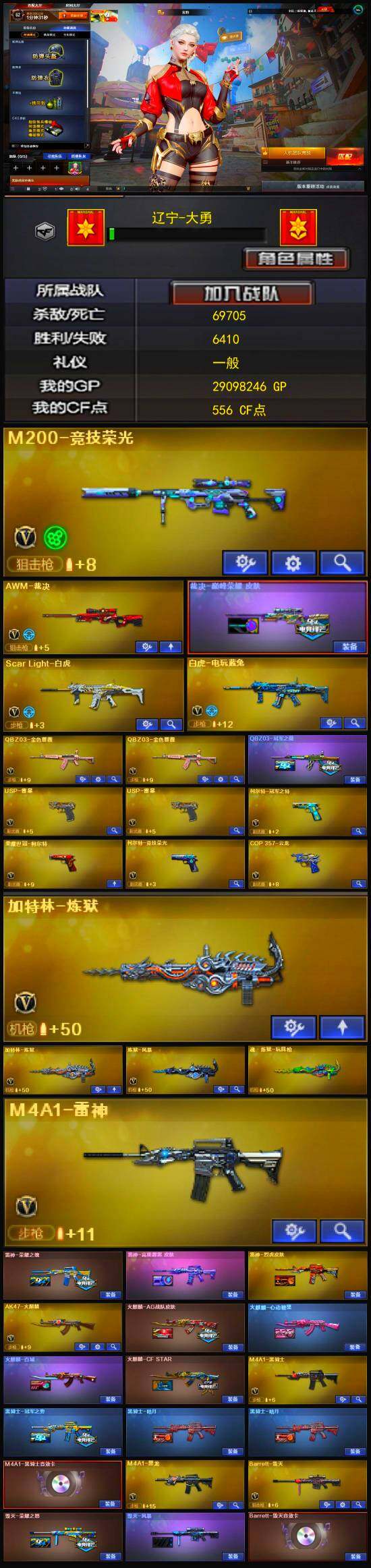 - [13887154]北方大区-28V-2王者-1炫金 【热门武器】:M200-幻神,M200-竞技荣光,白虎-电玩蓝兔,牛牛-AK47,M4A1-黑骑士*2,USP-雷暴 【王者炫金武器】:炫金武士 【音效卡】:M4A1-黑骑士音效卡,白鲨语音包 【皮肤】:M200-幻神-黄忠皮肤,幻神-降龙,QBZ03-AG-CFPLS19冠军,M4A1-战神赵云,火麒麟-战神关羽,火麒麟-心动糖果,毁灭-暗月,黑骑士-战神马超,战神-流金岁月皮肤,AK47-B-常胜将军-刘备 【角色】:电竞教官-云悠悠,战地猎狐,乔伊教练,暗夜-X,风暴女,嘉年华灵狐,娟娟,曼陀罗-礼服,潘多拉-甜心教官,斯沃特-X,兔囡囡 【人偶武器】:星神-炽天使,火麒麟-灵狐,AWM-灵狐-15周年嘉年华,COP-旗袍*2,牛牛-AK47,迷你超能女侍,生化手雷-机甲核心 【英雄级武器】:AK47-火麒麟*2,M4A1-雷神,M4A1-黑骑士*2,AK47-B-战神*2,AK47-B-常胜将军,白虎-电玩蓝兔,Barrett-毁灭,M200-幻神,M200-竞技荣光,USP-雷暴,柯尔特-电竞装甲,屠龙,尼泊尔-电竞装甲,M4A1-赤狱骑士 【特殊枪械】:2黑骑士