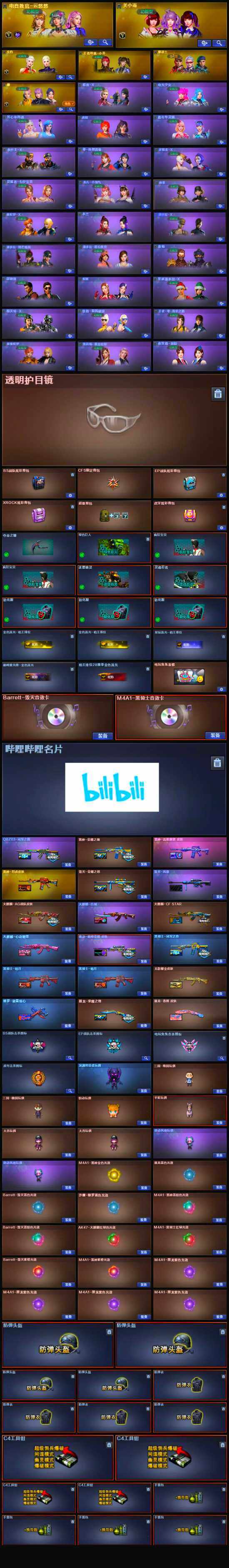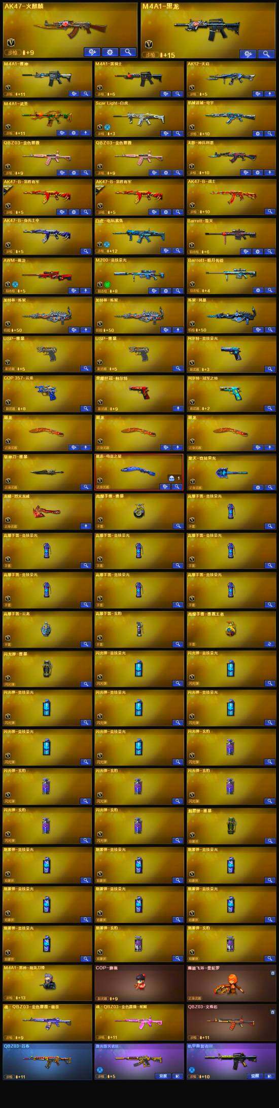 【英雄级武器】:AK47-火麒麟,M4A1-黑龙,M4A1-雷神,M4A1-黑骑士,AK12-天启,M4A1-武圣,Scar Light-白虎,无影-神兵利器,QBZ03-金色蔷薇*2,AK-47-猩红传说*4,AK47-B-常胜将军*2,白虎-电玩蓝兔,Barrett-毁灭,AWM-裁决,M200-竞技荣光,加特林-炼狱*2,炼狱-风暴,USP-雷暴*2,柯尔特-冠军之特,荣耀世冠-柯尔特,柯尔特-竞技荣光,COP 357-云龙,屠龙*3,擎天-竞技荣光,斩神刀-雷暴,麒麟刺-百战金芒,高爆手雷-雷暴,高爆手雷-竞技荣光*7,高爆手雷-云龙,高爆手雷-玄豹,闪光弹-雷暴,闪光弹-竞技荣光*7,闪光弹-玄豹*6,烟雾弹-雷暴,烟雾弹-竞技荣光*7,烟雾弹-玄豹*2,M4A1-赤狱骑士