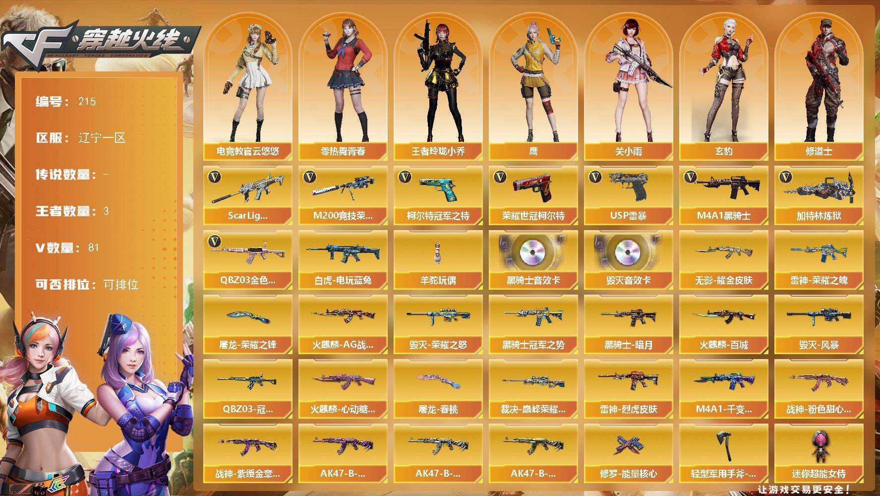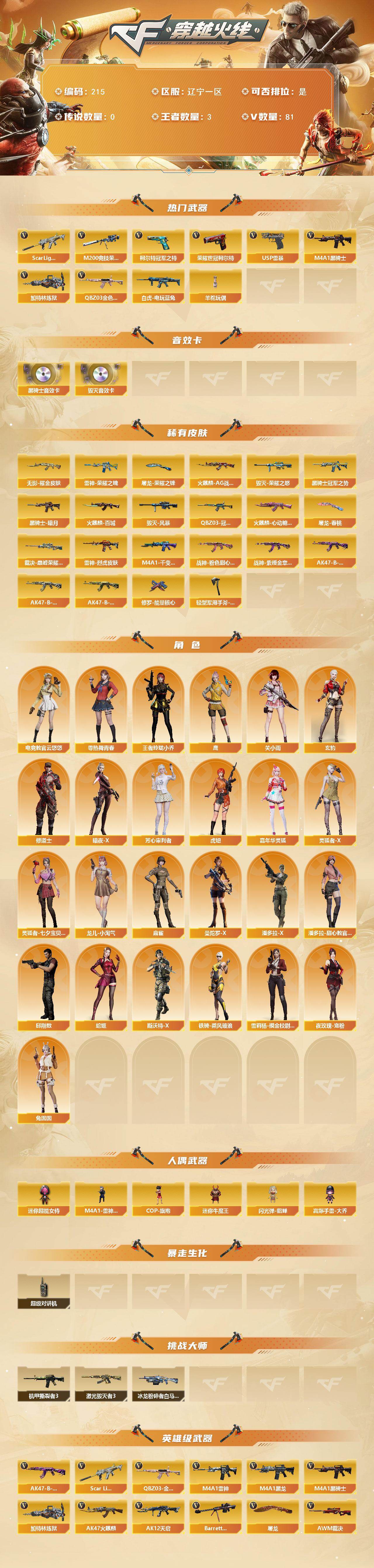 [14041444]辽宁一区-81V-3王者-0炫金 【热门武器】:QBZ03-金色蔷薇*2,Scar Light-白虎,M200-竞技荣光,白虎-电玩蓝兔,柯尔特-冠军之特,荣耀世冠-柯尔特,M4A1-黑骑士,加特林-炼狱*2,羊驼玩偶,USP-雷暴*2 【音效卡】:M4A1-黑骑士音效卡,Barrett-毁灭音效卡 【皮肤】:QBZ03-冠军之薇,裁决-巅峰荣耀 皮肤,雷神-荣耀之魄,雷神-烈虎皮肤,火麒麟-AG战队皮肤,火麒麟-百城,火麒麟-心动糖果,毁灭-荣耀之怒,毁灭-风暴,M4A1-千变-孔明皮肤,黑骑士-暗月*2,黑骑士-冠军之势,无影耀金皮肤,战神-粉色甜心皮肤,战神-紫绶金章皮肤*2,AK47-B-常胜将军-曹操*3,AK47-B-常胜将军-刘备,AK47-B-常胜将军-孙权,修罗-能量核心,屠龙-荣耀之锋,屠龙-春桃 皮肤,轻型军用手斧-再燃火线 【角色】:电竞教官-云悠悠,鹰,关小雨,玄豹,王者玲珑-小乔,修道士,暗夜-X,芳心审判者,虎妞,嘉年华灵狐,零-热舞青春,灵狐者-X,灵狐者-七夕宝贝,龙儿-小淘气,麻雀,曼陀罗-X,潘多拉-X,潘多拉-甜心教官,邱刚敖,蛇姬,斯沃特-X,铁骑-乘风破浪,兔囡囡,雪莉杨-摸金校尉,夜玫瑰-宠粉 【人偶武器】:M4A1-雷神-精英刀锋,COP-旗袍,迷你牛魔王,闪光弹-貂蝉,高爆手雷-大乔,迷你超能女侍 【暴走生化】:超级对讲机 【挑战大师】:冰龙粉碎者-白马银枪,激光毁灭者III,机甲撕裂者III 【英雄级武器】:AK47-火麒麟,M4A1-黑龙,M4A1-雷神,M4A1-黑骑士,AK12-天启,M4A1-武圣,Scar Light-白虎,无影-神兵利器,QBZ03-金色蔷薇*2,AK-47-猩红传说*4,AK47-B-常胜将军*2,白虎-电玩蓝兔,Barrett-毁灭,AWM-裁决,M200-竞技荣光,加特林-炼狱*2,炼狱-风暴,USP-雷暴*2,柯尔特-冠军之特,荣耀世冠-柯尔特,柯尔特-竞技荣光,COP 357-云龙,屠龙*3,擎天-竞技荣光,斩神刀-雷暴,麒麟刺-百战金芒,高爆手雷-雷暴,高爆手雷-竞技荣光*7,高爆手雷-云龙,高爆手雷-玄豹,闪光弹-雷暴,闪光弹-竞技荣光*7,闪光弹-玄豹*6,烟雾弹-雷暴,烟雾弹-竞技荣光*7,烟雾弹-玄豹*2,M4A1-赤狱骑士 【道具】:BS战队炫彩背包,CFS限定背