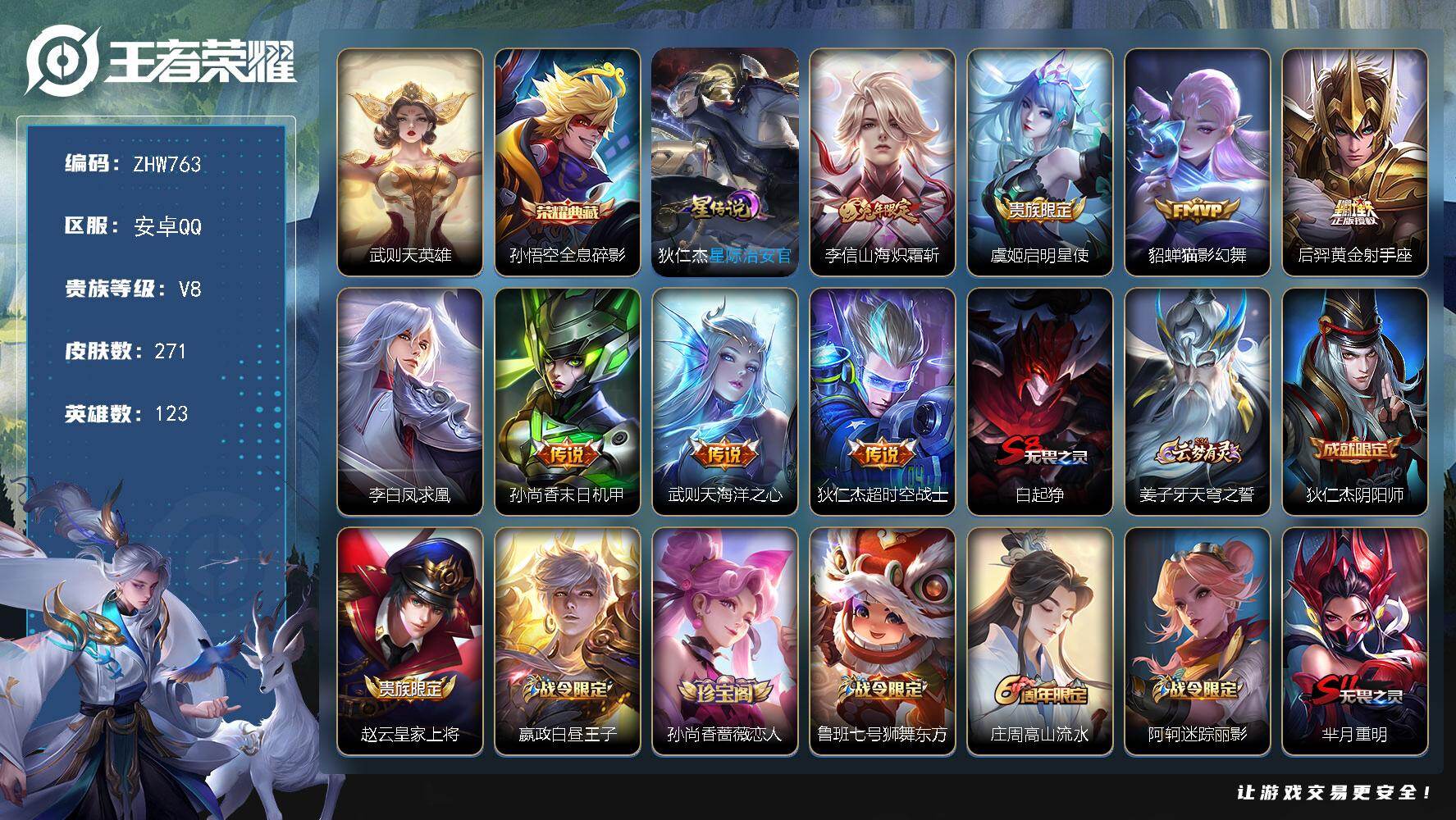 [14041990]安卓Q-V8-123英雄-271皮肤-1典藏-0珍品无双-0无双-0珍品传说-8传说-73史诗-1星元