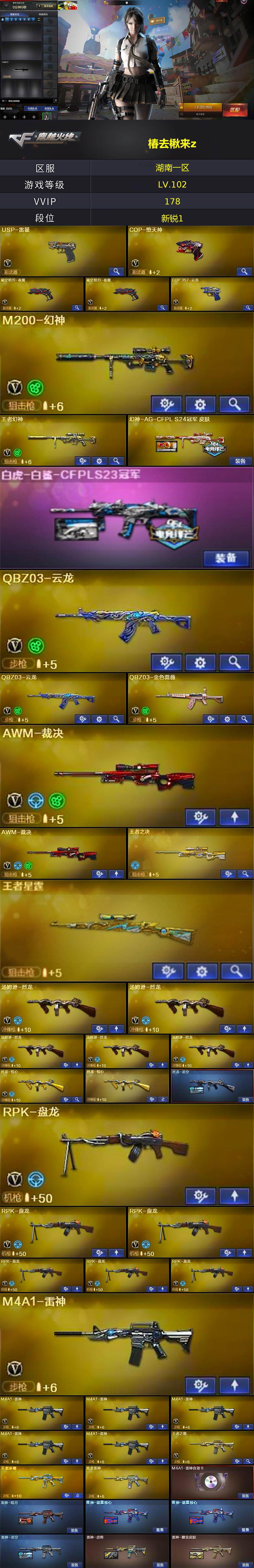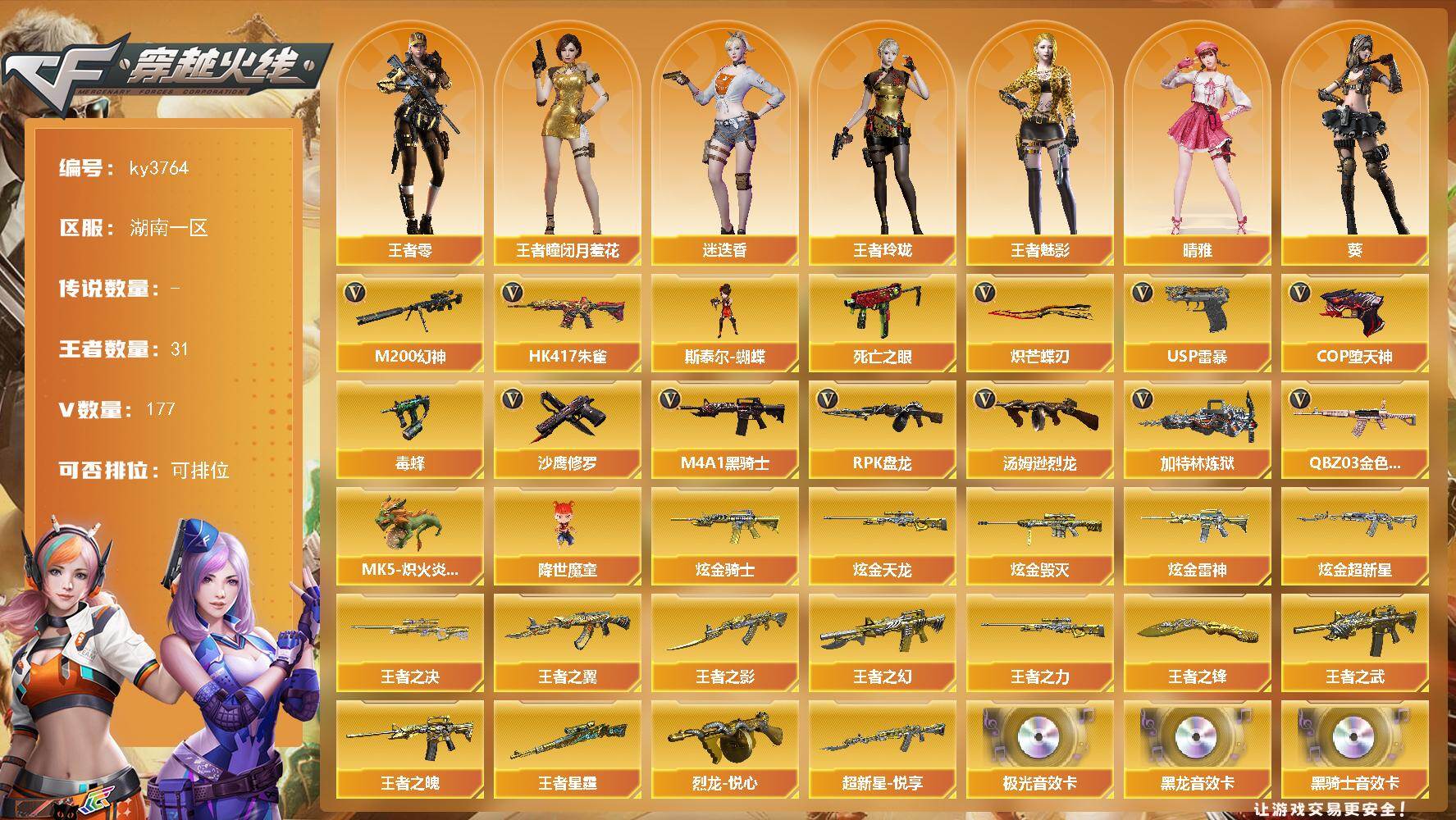 [14043108]湖南一区-177V-31王者-5炫金 【热门武器】:QBZ03-金色蔷薇,HK417-朱雀,M200-幻神,死亡之眼*4,毒蜂,M4A1-黑骑士*2,汤姆逊-烈龙*5,RPK-盘龙*6,加特林-炼狱*3,斯泰尔-蝴蝶,MK5-炽火炎龙,降世魔童*2,USP-雷暴,COP-堕天神,沙鹰-修罗*5,炽芒蝶刃 【王者炫金武器】:超新星-悦享,王者之幻,王者之翼,王者之武,王者之影,王者之魄,王者之决,王者之力*2,王者星霆,烈龙-悦心,王者之锋*3,炫金骑士,炫金雷神,炫金超新星,炫金毁灭,炫金天龙 【音效卡】:屠龙-云海游龙音效卡,AK47-火麒麟音效卡,M4A1-雷神音效卡,M4A1-黑龙音效卡,M4A1-黑骑士音效卡,Barrett-毁灭音效卡*2,Barrett-极光音效卡,死神-雪域霜狐-怀旧音效卡 【皮肤】:幻神-AG-CFPL S24冠军 皮肤,白虎-白鲨-CFPLS23冠军,烈龙-星空,雷神-暗月,雷神-能量核心*2,雷神-星空,雷神-虎将,雷神-耀金皮肤,火麒麟-雷神*3,火麒麟-冠军之心,火麒麟-轻羽皮肤,火麒麟-巅峰荣耀,毁灭-暗月*2,毁灭耀金皮肤,毁灭-星空*2,毁灭-冠军之怒,黑龙-能量核心,M4A1-黑龙-361,黑骑士耀金皮肤*2,无影耀金皮肤,AK47-黑武士-361,天启-暗月,战神-紫绶金章皮肤,战神-流金岁月皮肤,天龙-秘银,天龙-能量核心,AWM-天龙-传奇70KG,AWM-天龙-传奇白鲨*2,极光-能量核心*3,极光-高能霹雳 皮肤,修罗-能量核心*2,修罗-星空,天神-暗月,屠龙-荣耀之锋,屠龙-星火燎原,轻型军用手斧-再燃火线 【角色】:零,葵,迷迭香,凌霄,晴雅,华,战地猎狐,王者-瞳-闭月羞花,王者-零,王者玲珑,王者-魅影,狐影,雪域霜狐,空,暗夜-X,电竞少女,兰-新年限定,零-水下丽影,灵狐者-黄金海岸,龙儿,潘多拉-X,潜龙队-X,蜀雪,铁骑荣耀,雪莉杨,影武者-X,游珑儿 【人偶武器】:天龙-曼陀罗,M4A1-雷神-精英刀锋,MK5-炽火炎龙,斯泰尔-蝴蝶,M37-葵,COP-旗袍,夺魂,迷你生化手雷,闪光弹-小乔,降世魔童*2 【暴走生化】:毒蜂,死亡之眼*4 【挑战大师】:神圣爆裂者III,AK47-冰龙粉碎者,VEPR-12-金魔*2,激光毁灭者III,阐释者III 【英雄级武器】:M4A1-千变,AK