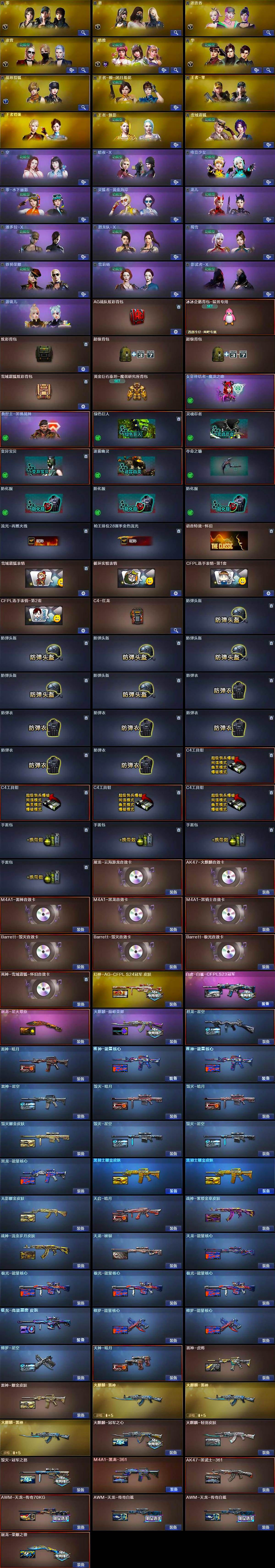 【皮肤】:幻神-AG-CFPL S24冠军 皮肤,白虎-白鲨-CFPLS23冠军,烈龙-星空,雷神-暗月,雷神-能量核心*2,雷神-星空,雷神-虎将,雷神-耀金皮肤,火麒麟-雷神*3,火麒麟-冠军之心,火麒麟-轻羽皮肤,火麒麟-巅峰荣耀,毁灭-暗月*2,毁灭耀金皮肤,毁灭-星空*2,毁灭-冠军之怒,黑龙-能量核心,M4A1-黑龙-361,黑骑士耀金皮肤*2,无影耀金皮肤,AK47-黑武士-361,天启-暗月,战神-紫绶金章皮肤,战神-流金岁月皮肤,天龙-秘银,天龙-能量核心,AWM-天龙-传奇70KG,AWM-天龙-传奇白鲨*2,极光-能量核心*3,极光-高能霹雳 皮肤,修罗-能量核心*2,修罗-星空,天神-暗月,屠龙-荣耀之锋,屠龙-星火燎原,轻型军用手斧-再燃火线