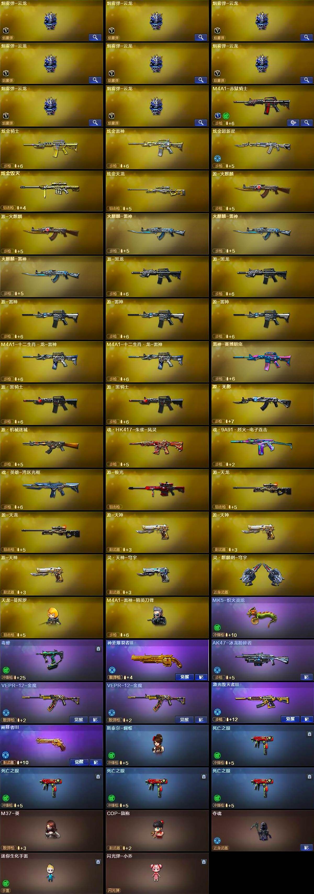【热门武器】:QBZ03-金色蔷薇,HK417-朱雀,M200-幻神,死亡之眼*4,毒蜂,M4A1-黑骑士*2,汤姆逊-烈龙*5,RPK-盘龙*6,加特林-炼狱*3,斯泰尔-蝴蝶,MK5-炽火炎龙,降世魔童*2,USP-雷暴,COP-堕天神,沙鹰-修罗*5,炽芒蝶刃