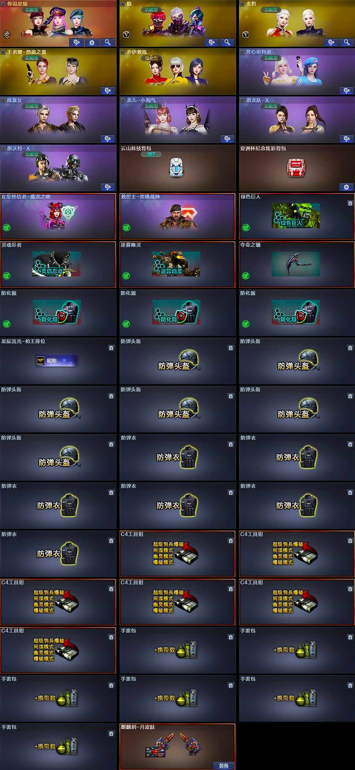 【道具】:云山科技背包,亚洲杯纪念炫彩背包,女皇终结者-魔龙之吻,救世主-黑桃战神,绿色巨人,灵魂忍者,迷雾幽灵,夺命之镰,防化服*3,星辰流光-枪王排位,防弹头盔*6,防弹衣*6,C4工具钳*6,手雷包*6