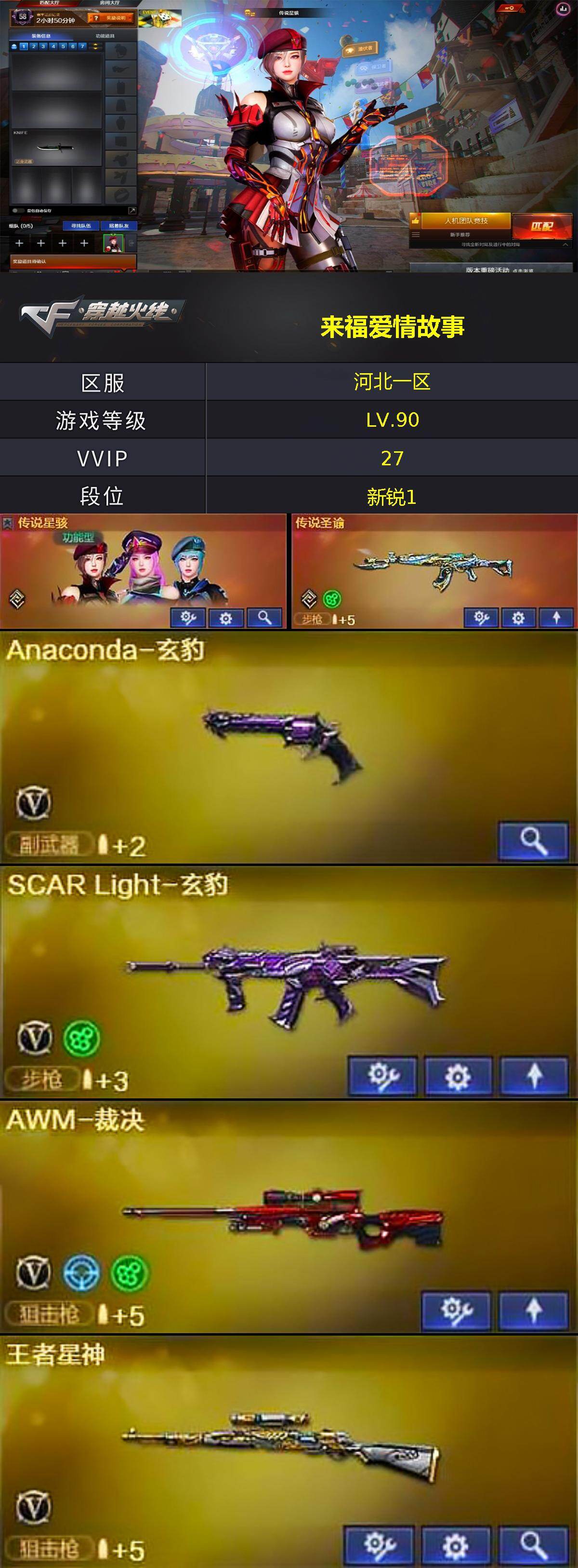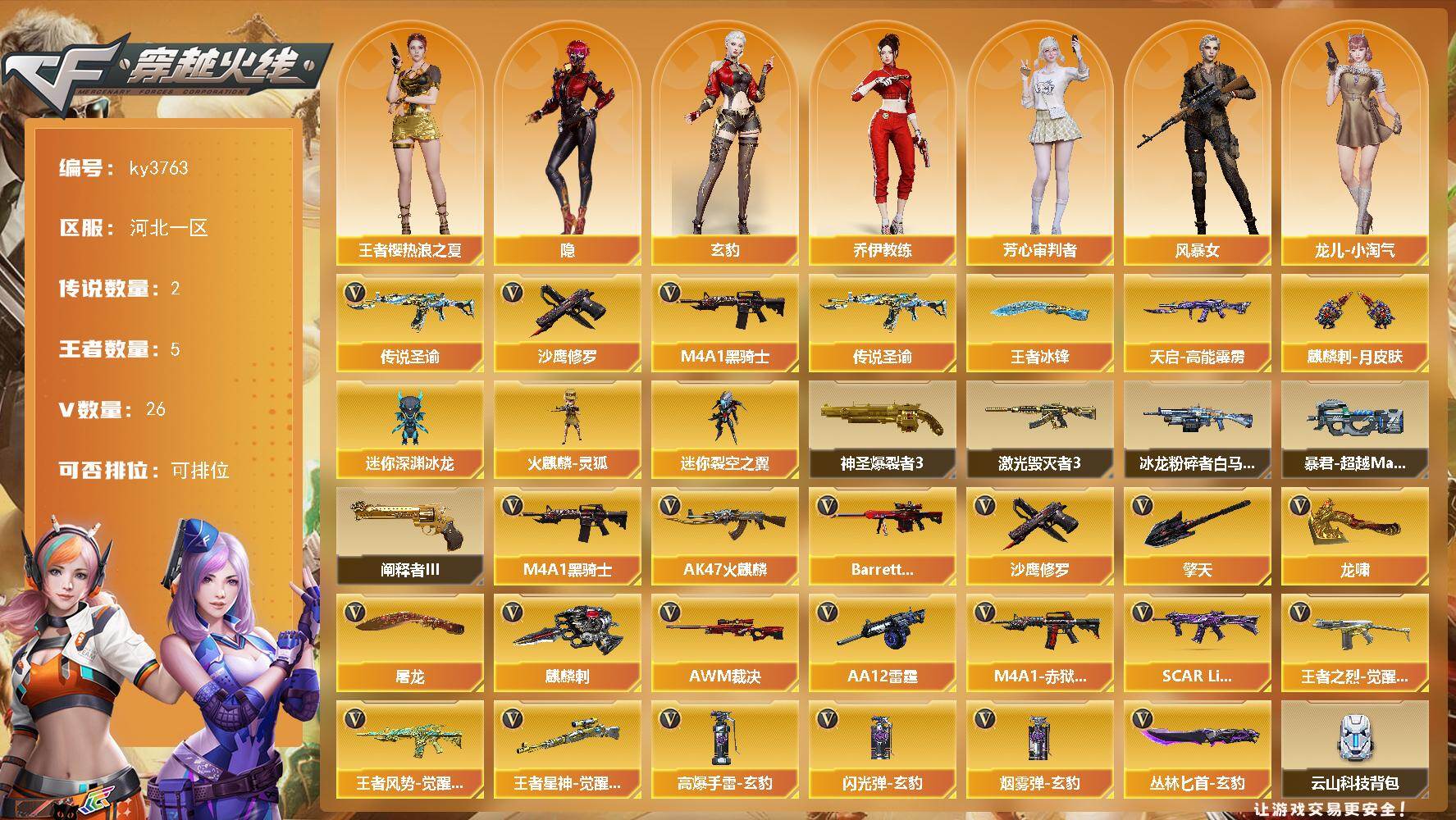 [14043400]河北一区-26V-5王者-0炫金 【传说武器】:传说圣谕 【传说角色】:传说星骇 【热门武器】:传说圣谕,M4A1-黑骑士,沙鹰-修罗 【王者炫金武器】:王者冰锋 【皮肤】:天启-高能霹雳 皮肤,麒麟刺-月皮肤 【角色】:隐,玄豹,王者樱-热浪之夏,乔伊教练,芳心审判者,风暴女,龙儿-小淘气,潜龙队-X,斯沃特-X 【人偶武器】:火麒麟-灵狐,迷你深渊冰龙,迷你裂空之翼*3 【挑战大师】:暴君乱世-超越Max,神圣爆裂者III,冰龙粉碎者-白马银枪,激光毁灭者III,阐释者III 【英雄级武器】:AK47-火麒麟,M4A1-黑骑士,SCAR Light-玄豹,王者之烈-觉醒版,王者风势-觉醒版,Barrett-极光,AWM-裁决,王者星神-觉醒版,AA-12-雷霆,沙鹰-修罗,Anaconda-玄豹,屠龙,龙啸,擎天,麒麟刺,丛林匕首-玄豹,高爆手雷-玄豹*5,闪光弹-玄豹*3,烟雾弹-玄豹*2,M4A1-赤狱骑士 【道具】:云山科技背包,亚洲杯纪念炫彩背包,女皇终结者-魔龙之吻,救世主-黑桃战神,绿色巨人,灵魂忍者,迷雾幽灵,夺命之镰,防化服*3,星辰流光-枪王排位,防弹头盔*6,防弹衣*6,C4工具钳*6,手雷包*6 【特殊枪械】:1黑骑士