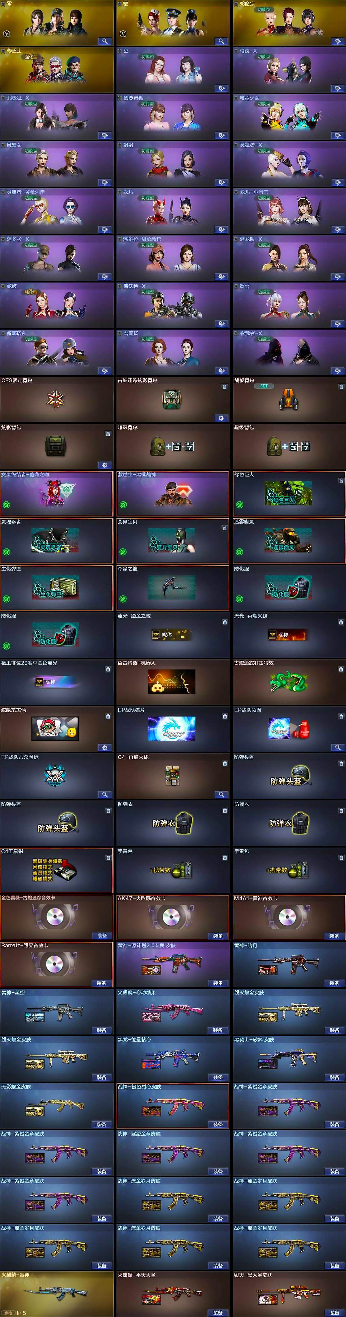 【皮肤】:雷神-暗月,雷神-星空,雷神-源计划2.0专属 皮肤,火麒麟-雷神,火麒麟-平天大圣,火麒麟-心动糖果,毁灭耀金皮肤*2,毁灭-黑大圣皮肤,黑龙-能量核心,黑骑士-破界 皮肤,无影耀金皮肤,战神-粉色甜心皮肤,战神-紫绶金章皮肤*5,战神-流金岁月皮肤*5,AK47-B-常胜将军-曹操,AK47-B-常胜将军-刘备,AK47-B-常胜将军-孙权*2