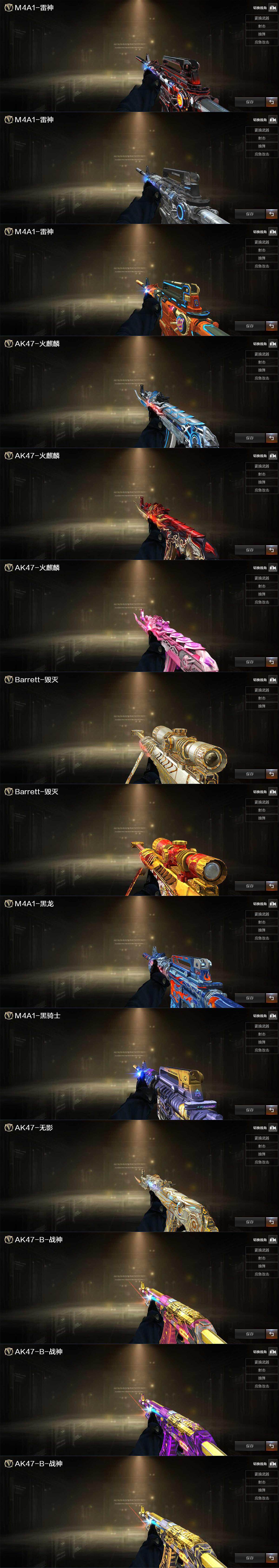 【英雄级武器】:AK47-火麒麟*3,M4A1-黑龙*2,M4A1-雷神*2,M4A1-黑骑士*4,AK47-无影*2,M4A1-死神,AK47-黑武士*2,AK12-天启,AN94-超新星,AK47-黑鲨,金色蔷薇-古蛇迷踪,QBZ03-金色蔷薇,王者之魄-觉醒版,超新星-悦享-觉醒版,AK-47-猩红传说*9,AK47-B-战神,黑骑士-海王*2,AK47-B-常胜将军,王者之烈-觉醒