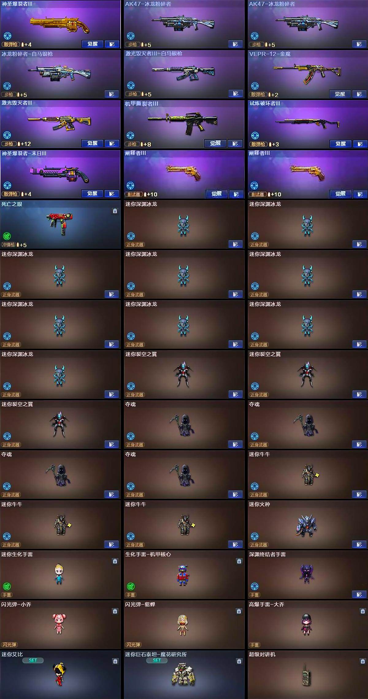 【人偶武器】:雷神-小红,火麒麟-灵狐*2,迷你深渊冰龙*9,迷你裂空之翼*3,夺魂*4,迷你牛牛*3,迷你火种,迷你生化手雷,生化手雷-机甲核心,深渊终结者手雷,闪光弹-小乔,闪光弹-貂蝉,高爆手雷-大乔,迷你艾比,迷你巨石泰坦-魔花研究所